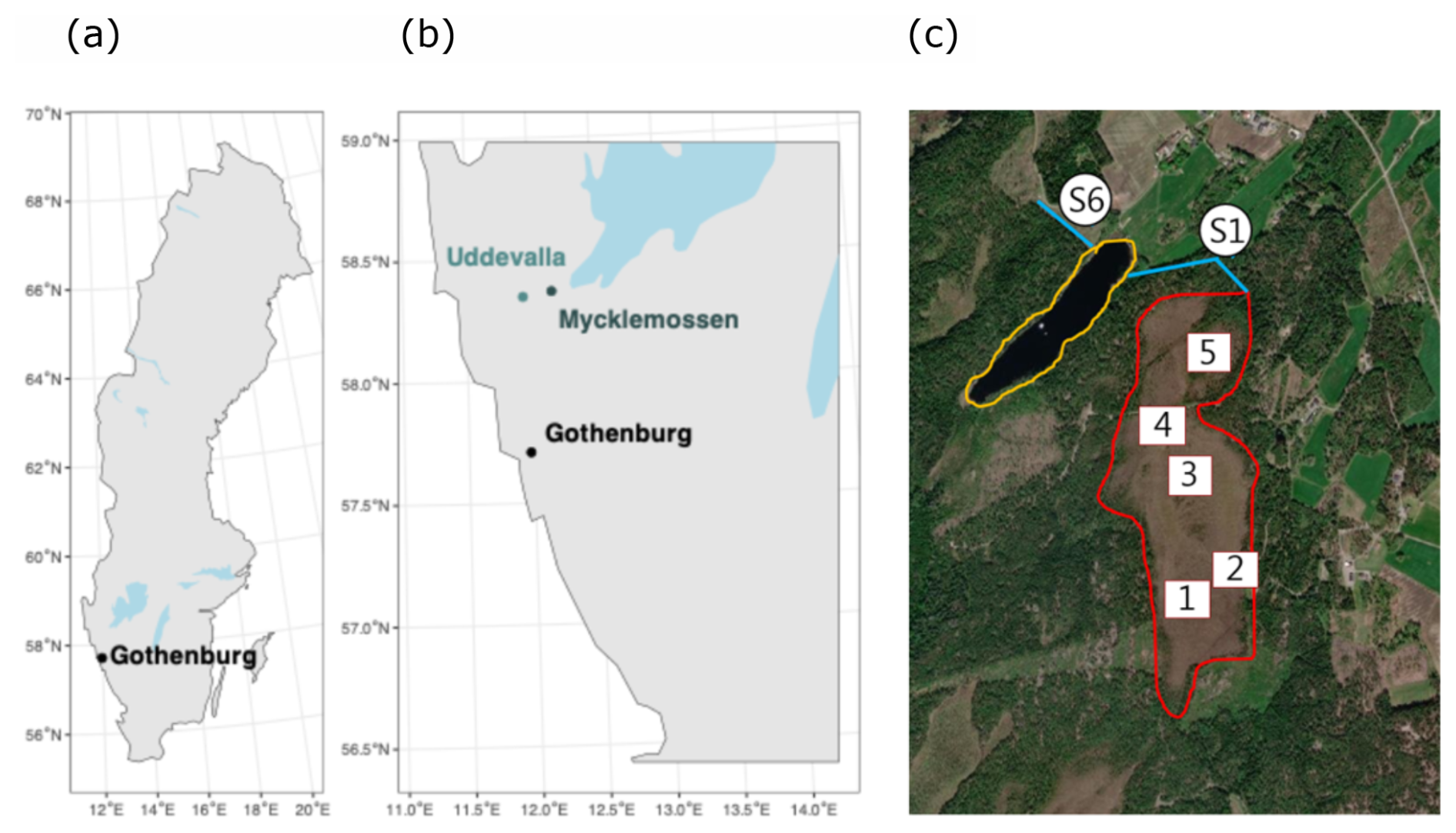 Figure 1(a) Map of Sweden, (b) Mycklemossen mire located east of Uddevalla where a ship wharf was active until 1985, (c) the mire-lake complex comprising of Mycklemossen mire (encircled in red) and lake Erssjön (encircled in yellow). Sampling points in Mycklemossen are marked as 1–5 and the stream sampling location from Mycklemossen are marked as S1 and the stream from Erssjön as S6. Satellite photo from https://meta.fieldsites.se/resources/stations/Skogaryd (last access: 28 April 2025).
