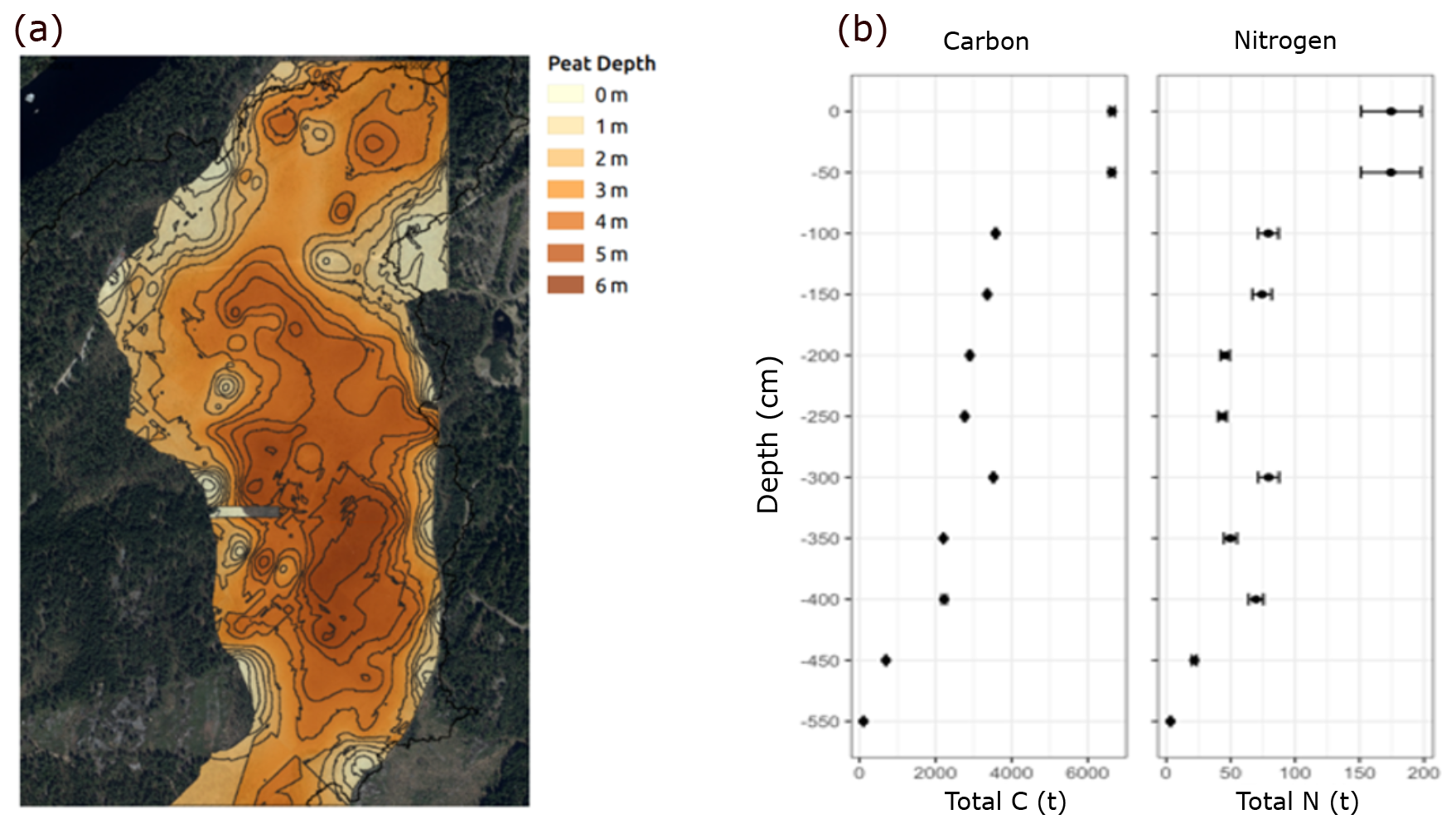 Figure 2Spatial distribution of peat depth based on radar bathymetry (a) and total C and N pools in 50 cm depth increments (b) in Mycklemossen.
