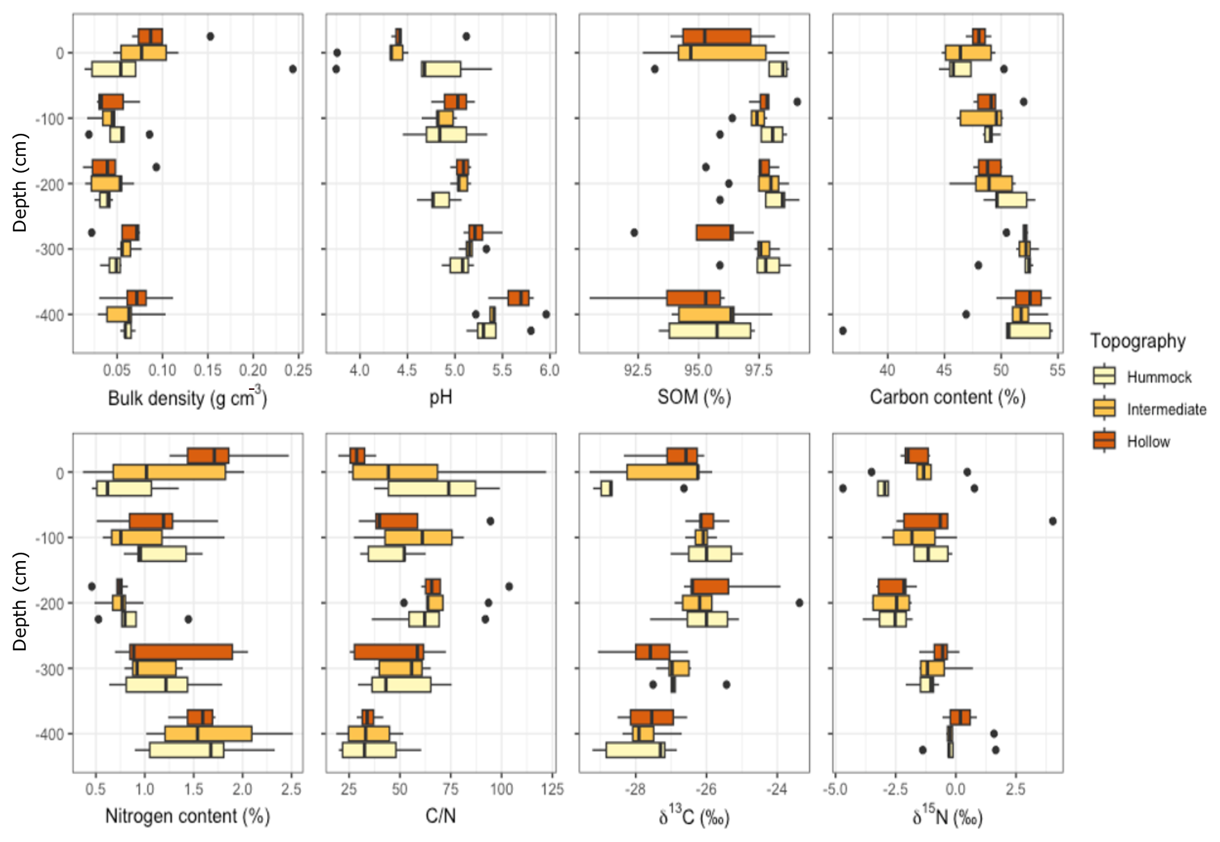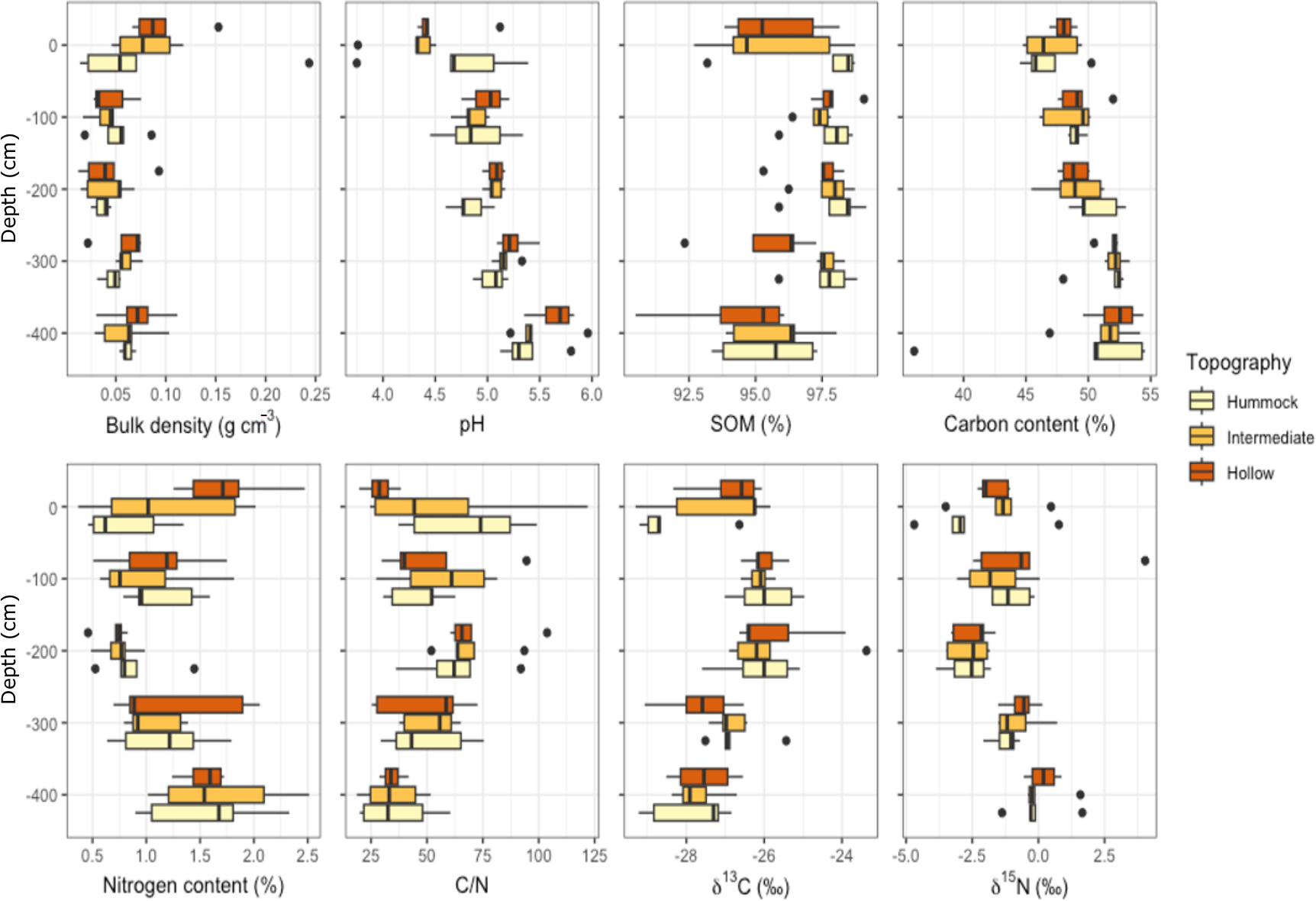 Figure 3Peat properties in Mycklemossen. Peat samples in five locations and three topography types at 100 cm interval from the surface to 4 m depth. Box plots show the median value with the lower and upper quartile.