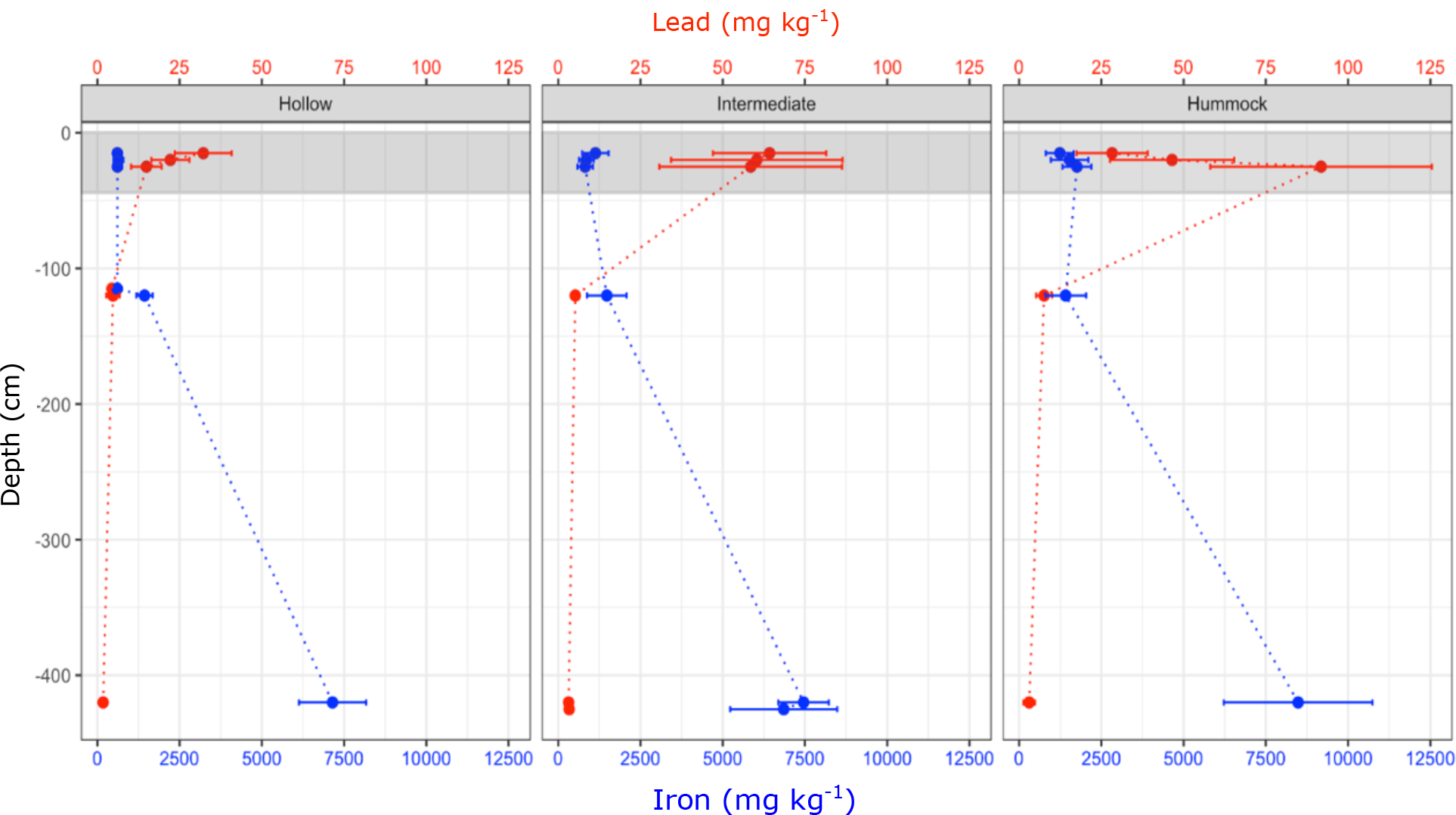Figure 4Pb (red) and Fe (blue) concentrations (mg kg−1 DM) in peat at various depths of Mycklemossen. Points are means of 5 sampling locations and error bars are SE. Dotted lines are included for illustration only. Grey bands indicate the zone affected by water-table fluctuations measured as absolute minimum and maximum water-table depth during the period 2017–2021. For statistics see Table S8.