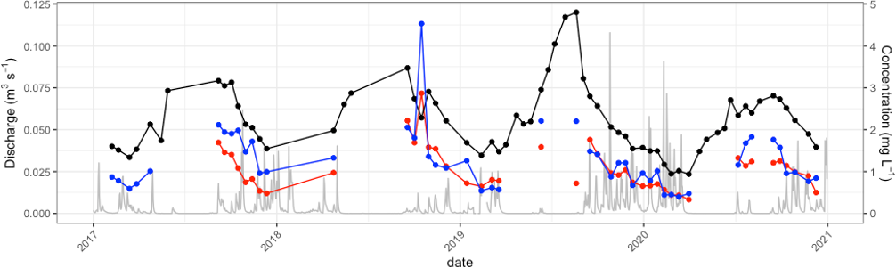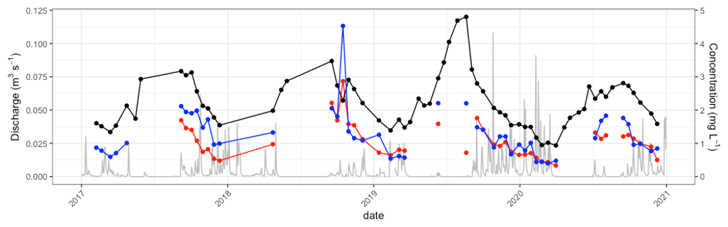 Figure 5Stream discharge (grey), and water concentration of Fe (blue) and Pb×200 (red) and C in DOC×0.05 (black) from S1. Discharge shows daily averages of measurements made every 15 min, whereas concentrations in water were analysed from grab samples usually every 2–3 weeks during high flow and throughout 2019. Dots mark timing of sampling. Data points for Fe and Pb were removed when discharge <0.0001 (m3 s−1), which occurred during summer when the water level was too low to measure discharge, making calculation of export impossible.