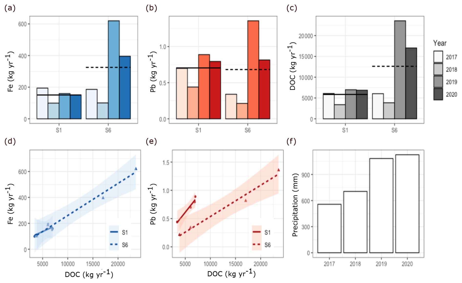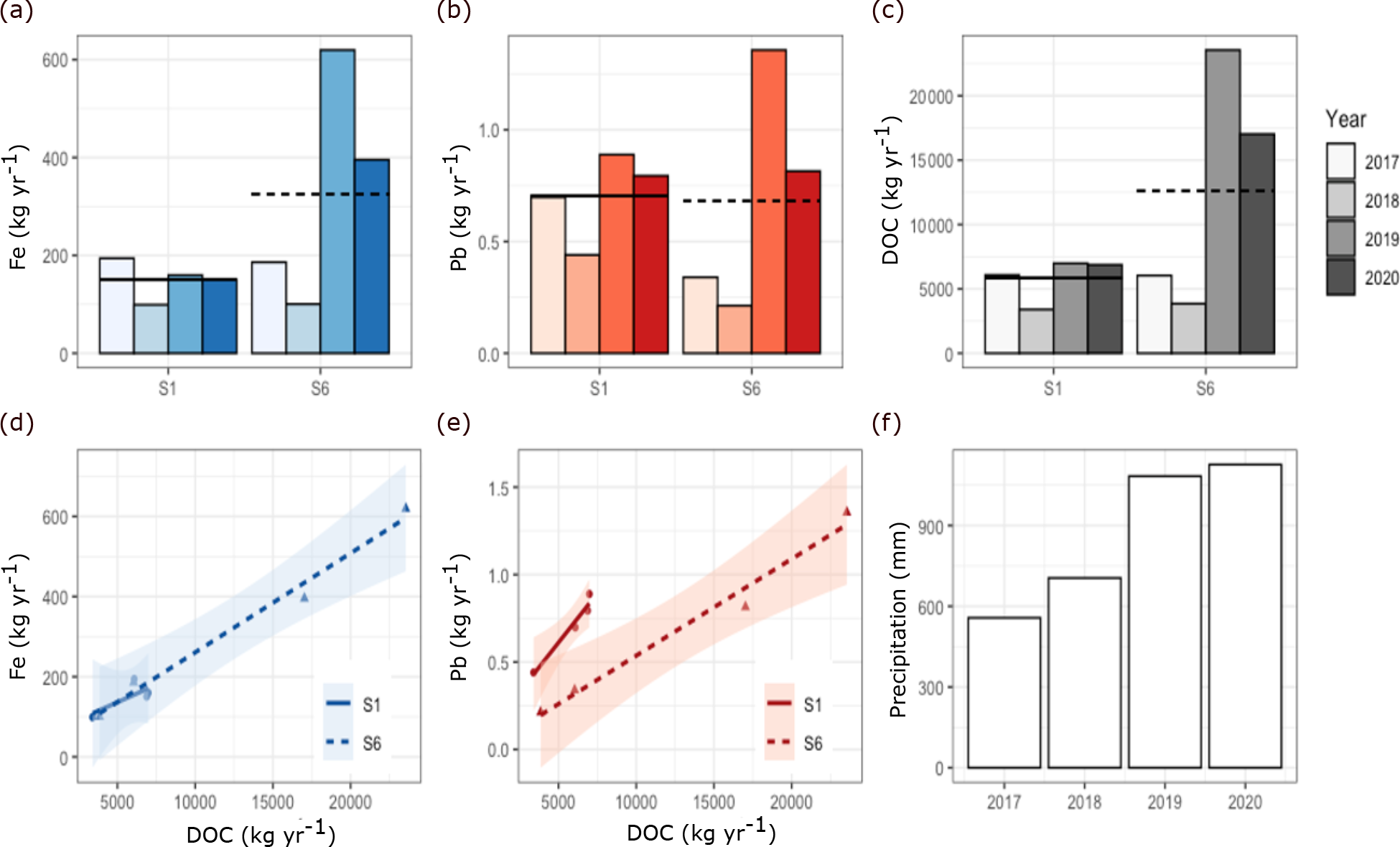 Figure 6Annual export of DOC, Fe and Pb from Mycklemossen to Erssjön lake (S1) and from Erssjön (S6) in 2017 to 2020 (a–c) and the linear relationship between export of DOC and export of Fe and Pb (d, e). Horizontal lines in bar chart are means of the years 2017–2020 in S1 (solid line) and S6 (hatched line). Note differences in scale between plots. Annual precipitation for the years 2017–2020 (f).
