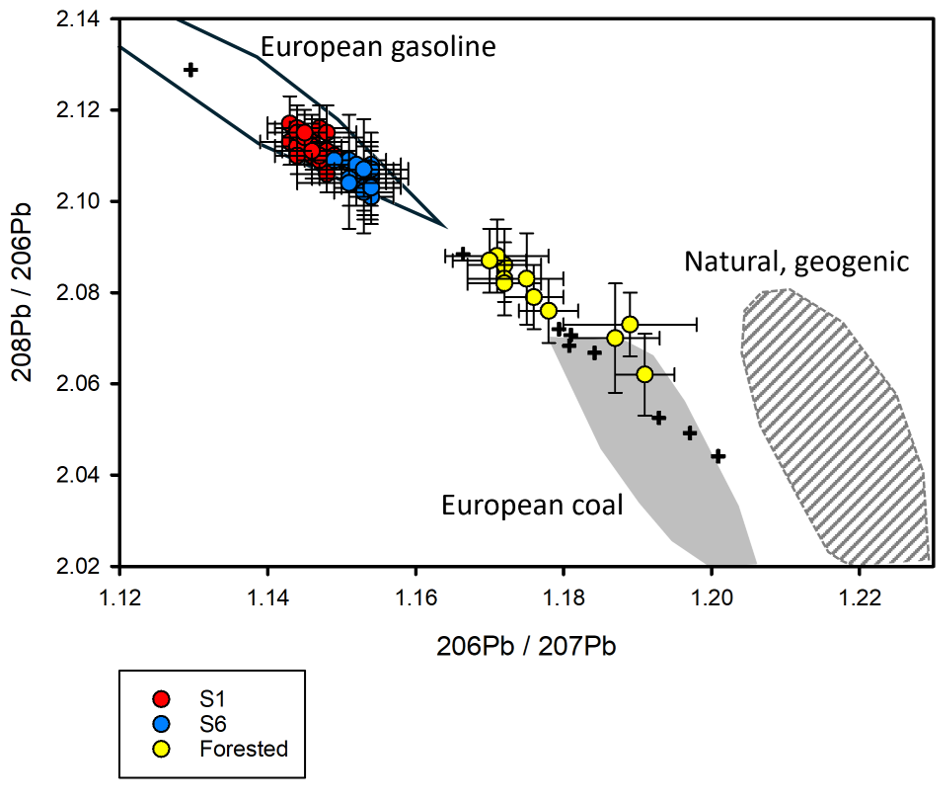 Figure 7Lead isotope composition of water from S1, S6 and forest land at Skogaryd Research Catchment, overlying an isotope plot of different Pb sources (redrawn from Komárek et al., 2008). Crosses represent the isotopic composition of marine antifouling (data from Jeong et al., 2023).