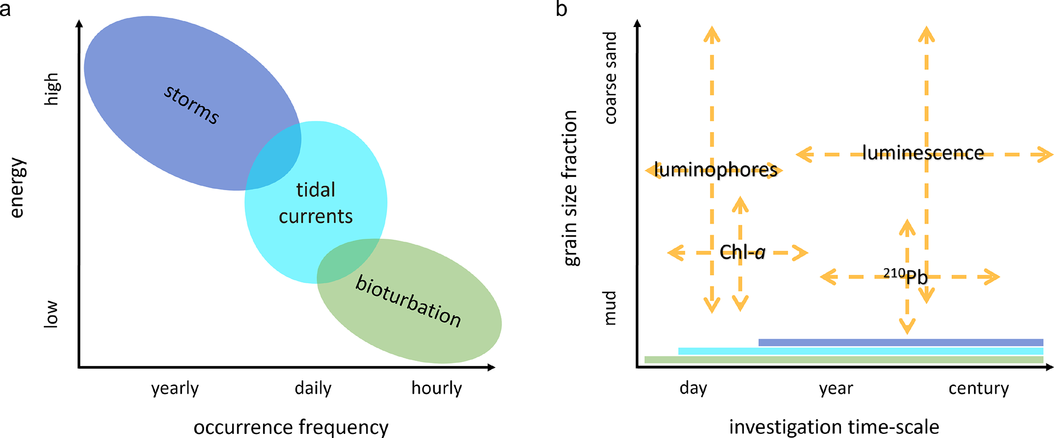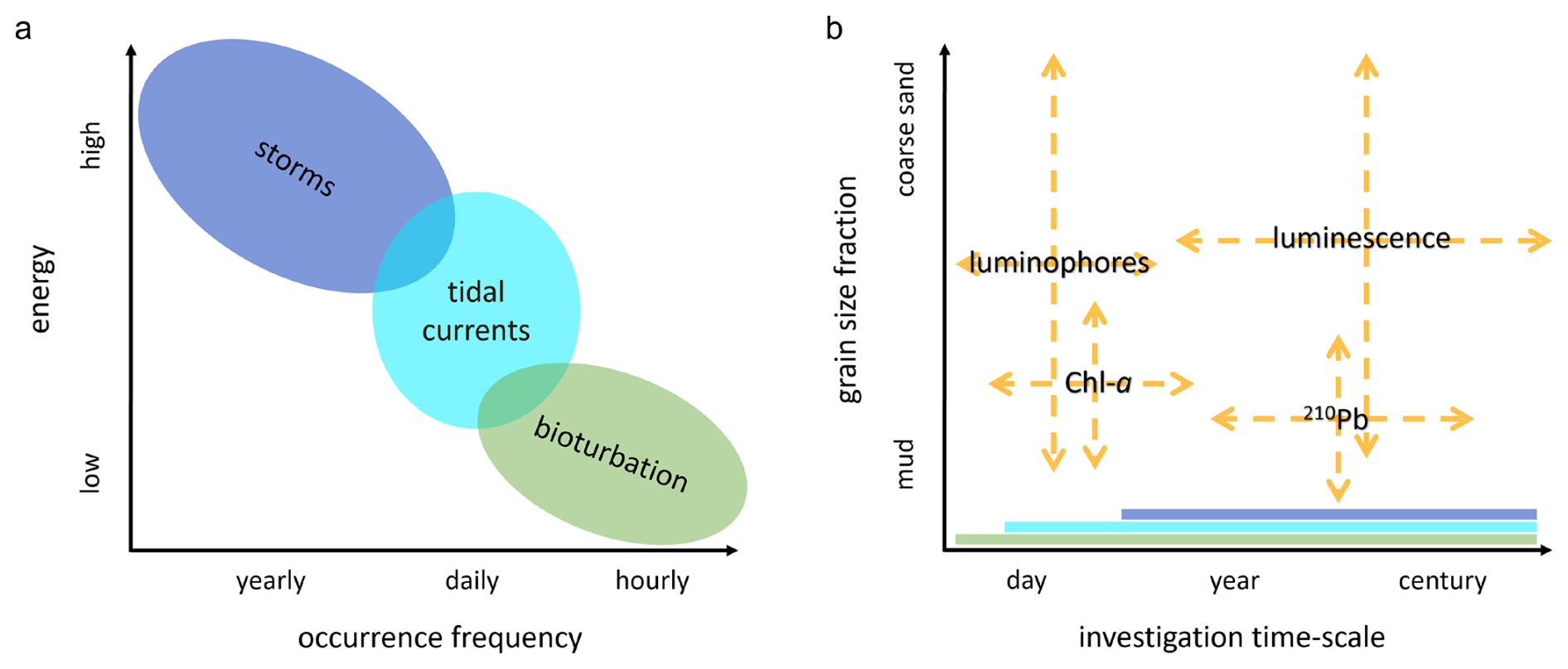 Figure 1(a) mixing processes with their occurrence frequency and energy; (b) sediment tracers with their relevant investigation timescales and potential target sediment fraction. The mixing processes that are recorded in the tracer distributions, depending on the moment and period of sampling, are indicated as bands along the x-axis.