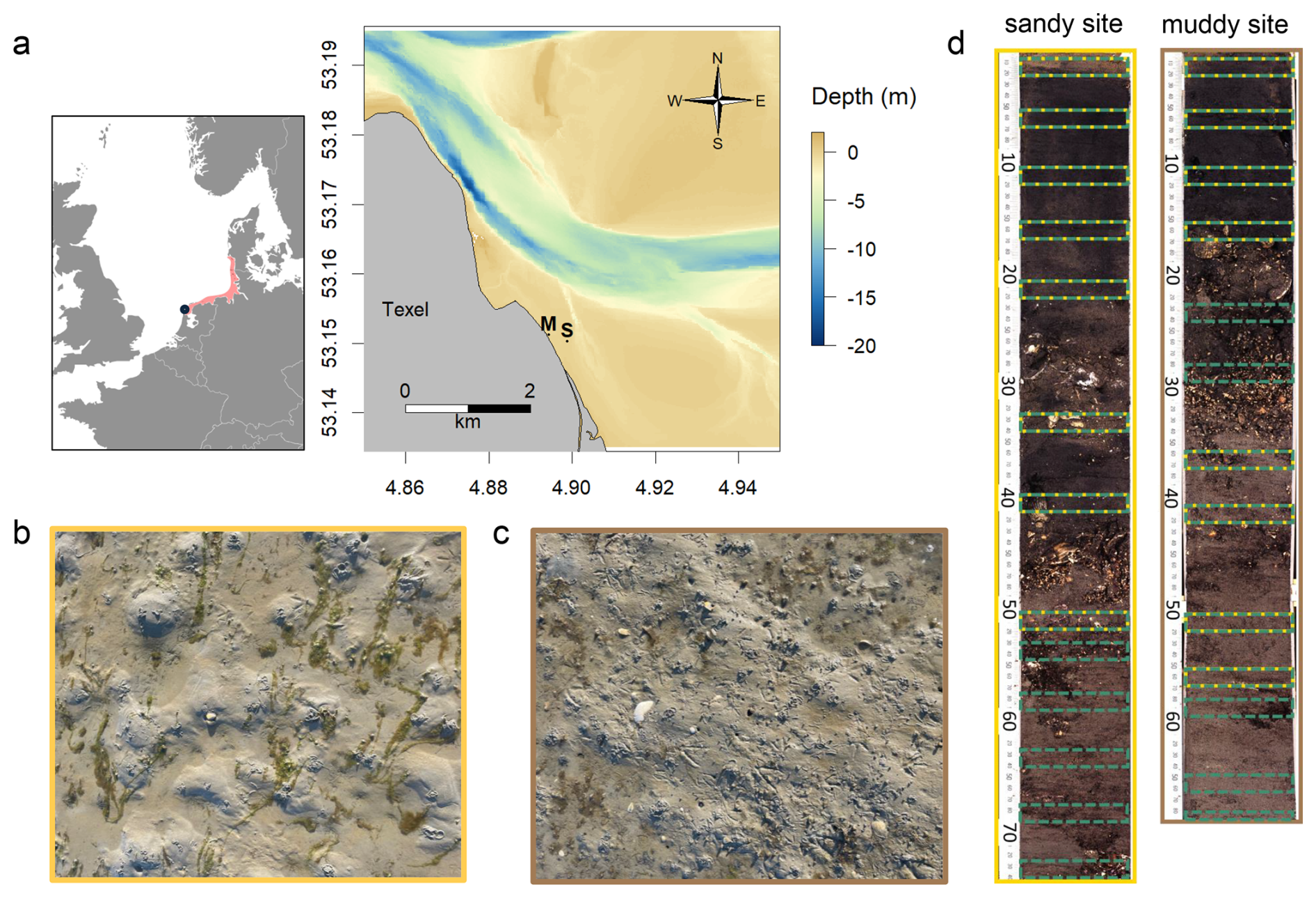 Figure 2(a) Map and bathymetry of the study area, located north-east off the island of Texel Wadden Sea (Netherlands), with muddy (M) and sandy (S) sampling locations indicated. The inset shows the location of the Wadden Sea (red) in western Europe, and the location of the study site (blue dot); picture of sediment surface at the sandy site (b – yellow) and muddy site (c – brown); (d) core scan from long cores from both sites, with the sampling intervals for 210Pb (green) and luminescence (yellow) samples indicated.