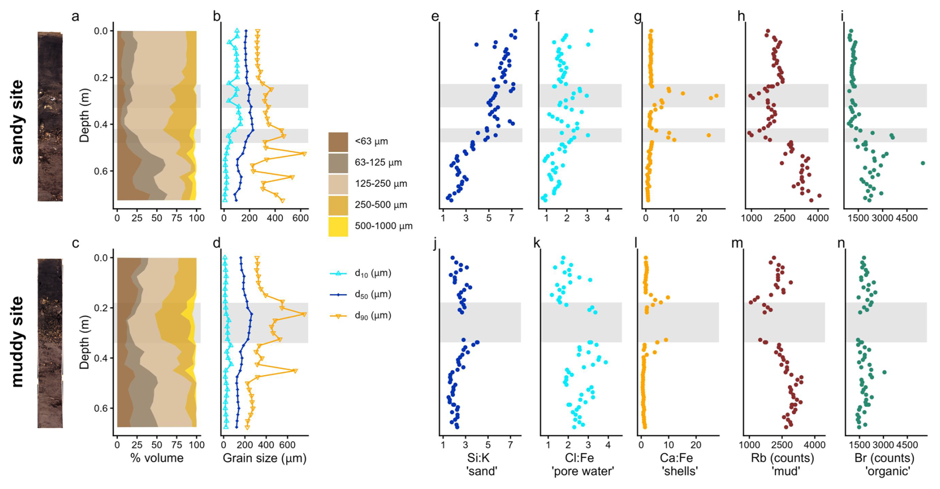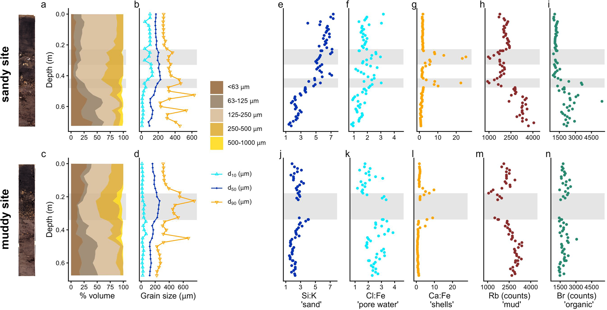 Figure 3Sediment composition at the sandy site (top) and muddy site (bottom): stacked grain size fractions (a, c); d10, d50 and d90 (b, d); elemental composition (e–n): Si:K, higher ratios indicate sand; Cl:Fe, higher ratios indicate marine pore water; Ca:Fe, higher ratios indicate shells; Rb counts representative of silt and clay, and Br counts, representative of organic matter. Note that the cumulative grain size fractions (a, c) do not amount to 100 % when coarse > 1000 µm material was present. The data gap in the mud cores (j–n) resulted from a scanning failure due to the presence of a brick. Grey bands show the shell layers. The core scans are shown left of the figure.