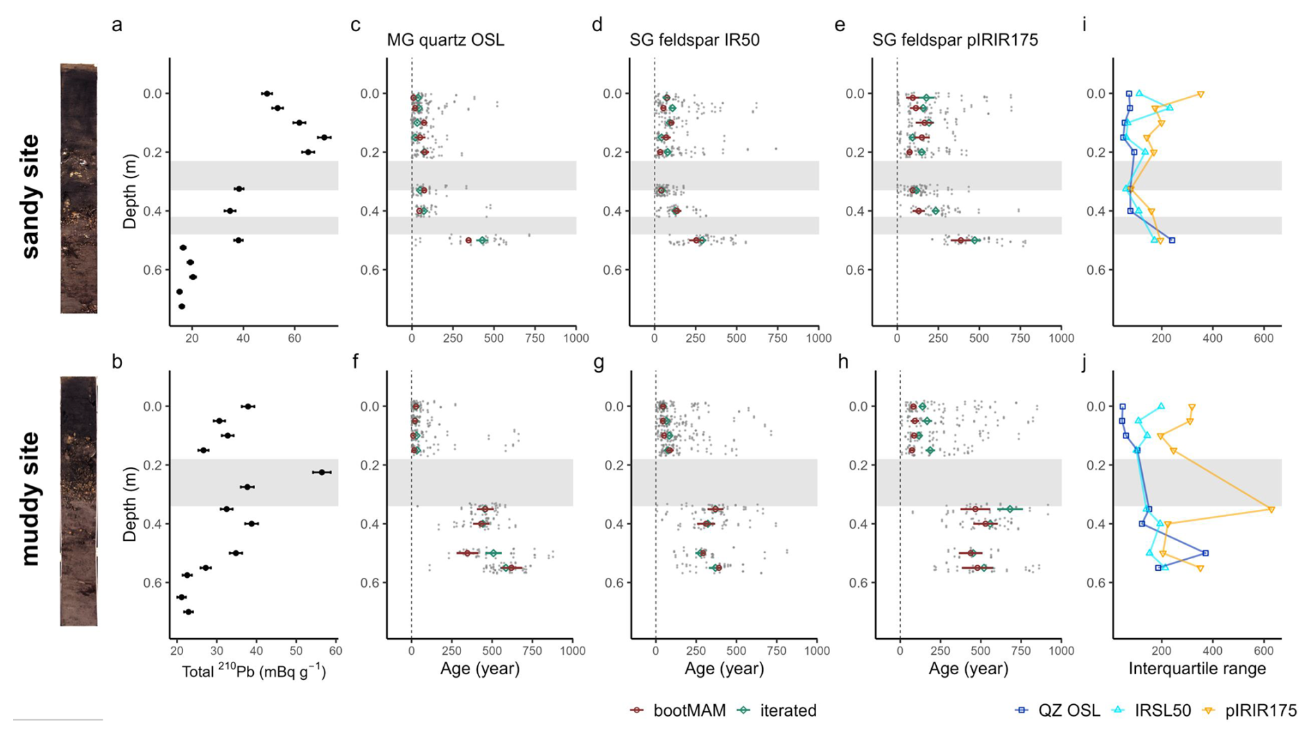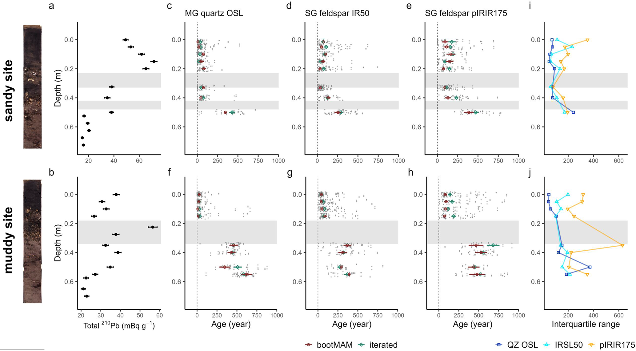 Figure 4Tracer profiles from 210Pb (a, b) and luminescence signals, with the single-aliquot or single-grain data jittered in grey and green and red markers indicating the modelled iterated or bootMAM age with standard error (c–h); interquartile range of luminescence age distribution (i, j) for the sandy (top) and muddy site (bottom). Grey bands indicate the shell layers. The core scans are shown left of the figure.