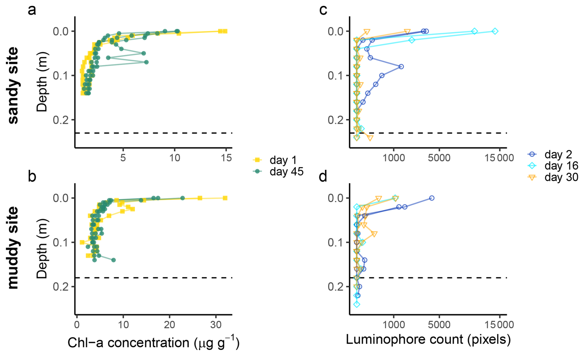 Figure 5Chlorophyll a (a, b) and luminophore (c, d) profiles from the sandy site (top) and muddy site (bottom), sampled at different time points (day, starting from 21 August 2023). Note that the x-axis of the luminophore plots was square-root-transformed to increase the visibility of low pixel counts. The dashed line indicates the depth of the top of the shell layer, as determined from the deep cores.