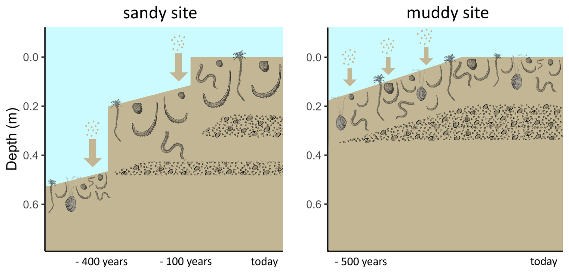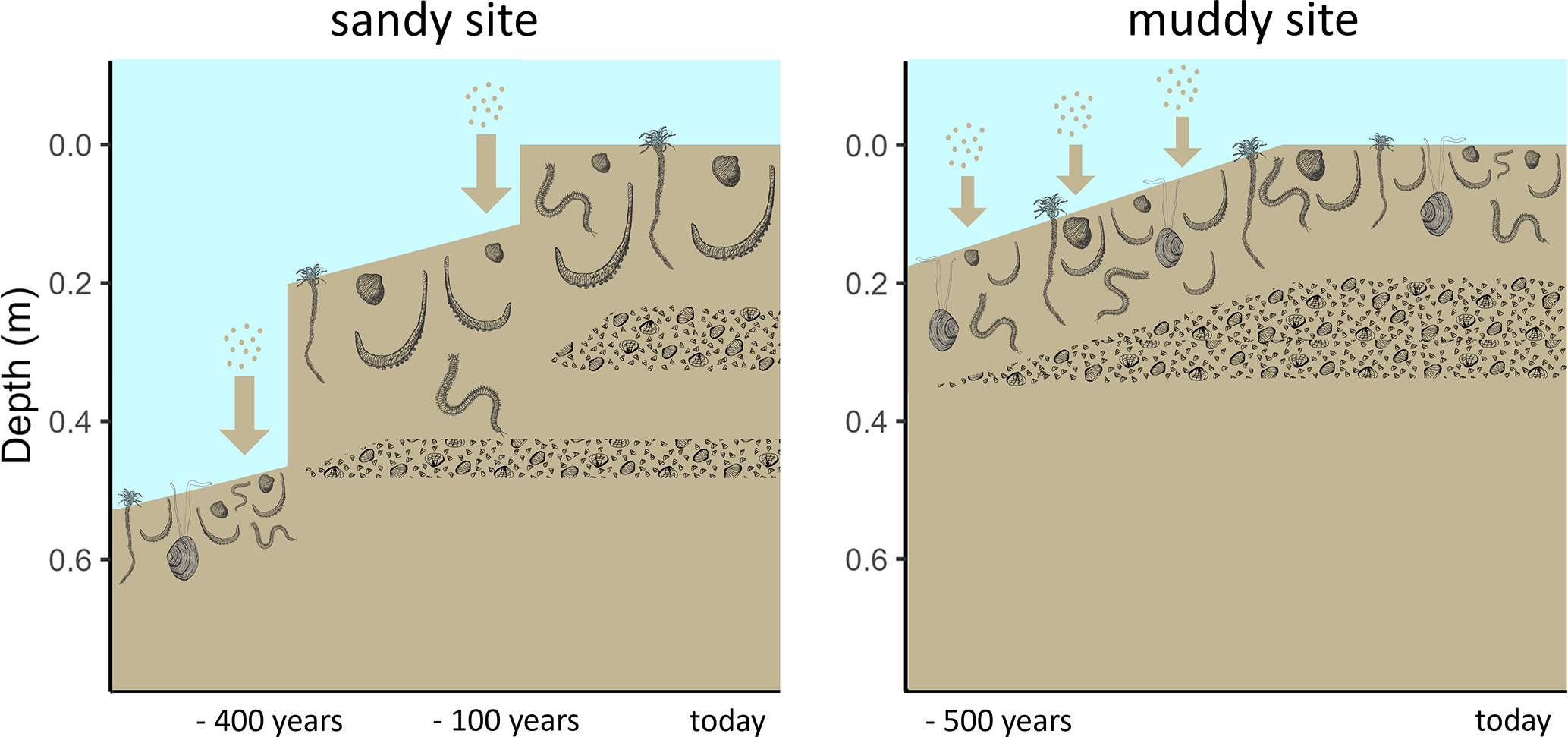 Figure 6Conceptual diagram of sedimentation history scenarios of the sandy (left) and muddy (right) site. Larger arrows represent more rapid sedimentation. The depth represents the current depth in the cores. Shell layers and benthic community are represented schematically with a lower species abundance and biomass, but larger lugworms (Arenicola marina) on the sandy compared to the muddy site.