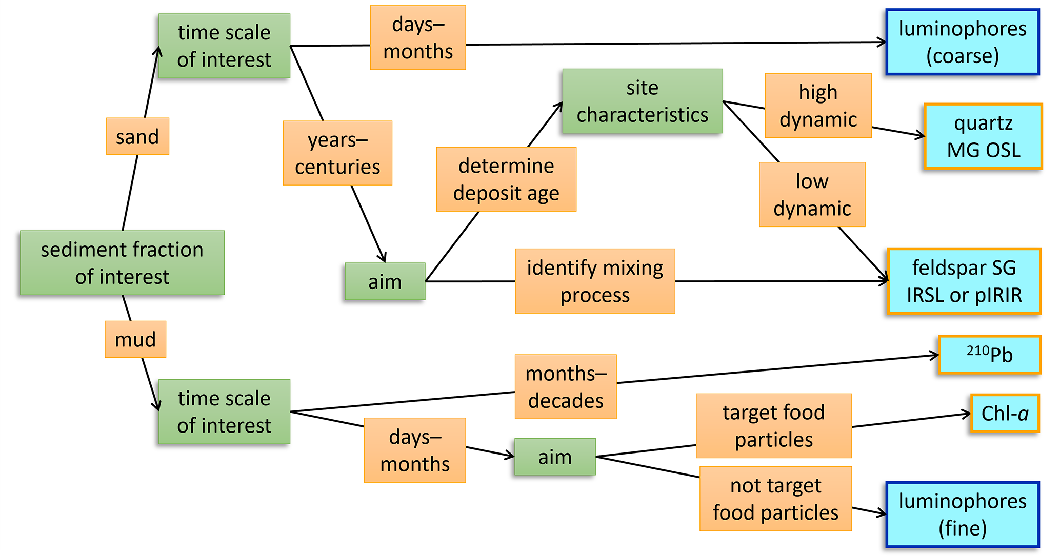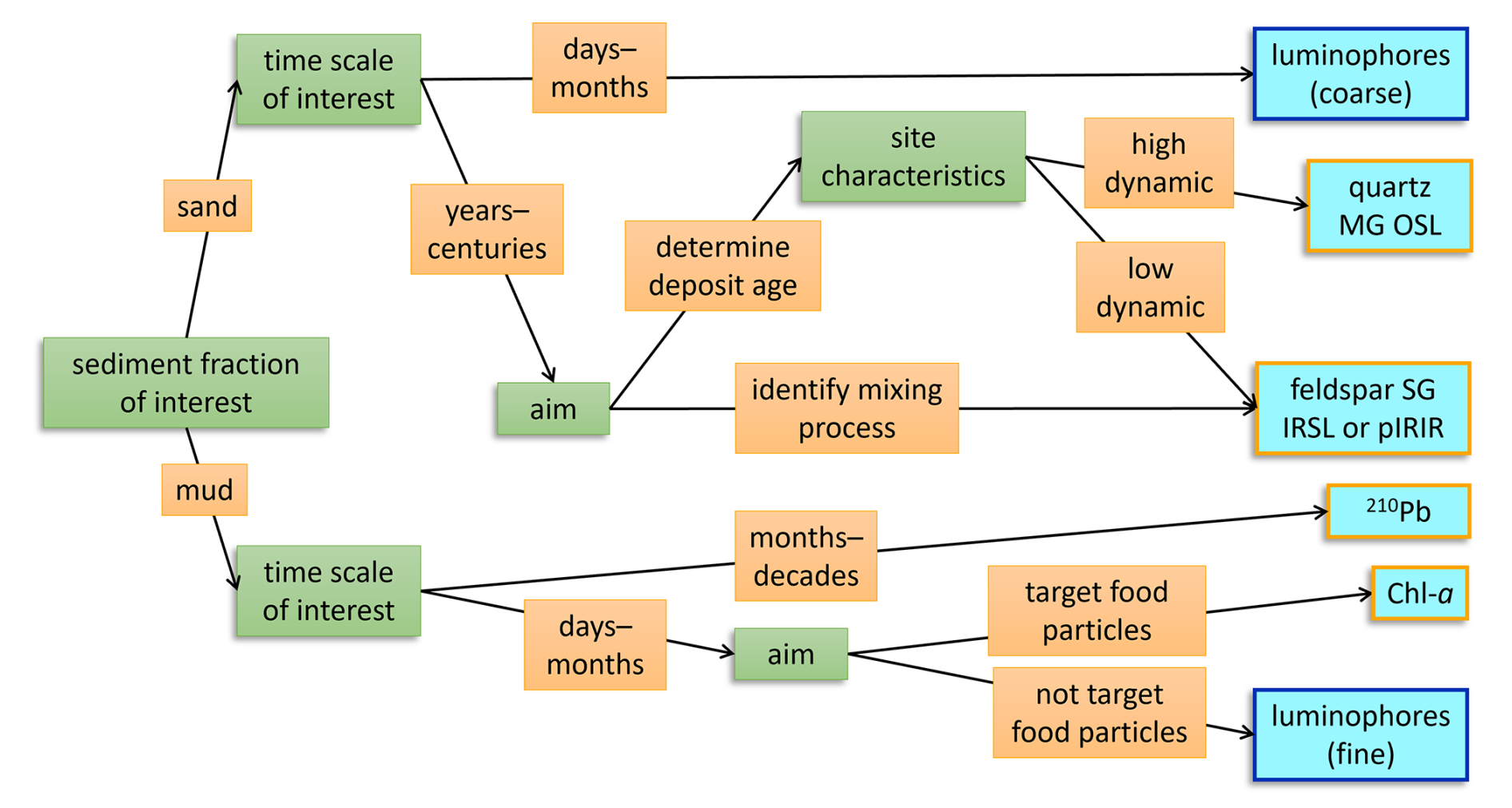 Figure 7A decision tree for choosing the appropriate tracer type to identifying sediment reworking in intertidal environments. Green boxes indicate the attributes of the research question at hand that should be considered and orange boxes show the possible responses, ultimately leading to the most suitable tracer (light blue boxes). The blue-outlined tracers are particles that actively need to be introduced in a natural system, while the orange-outlined tracers are native in intertidal sediments.