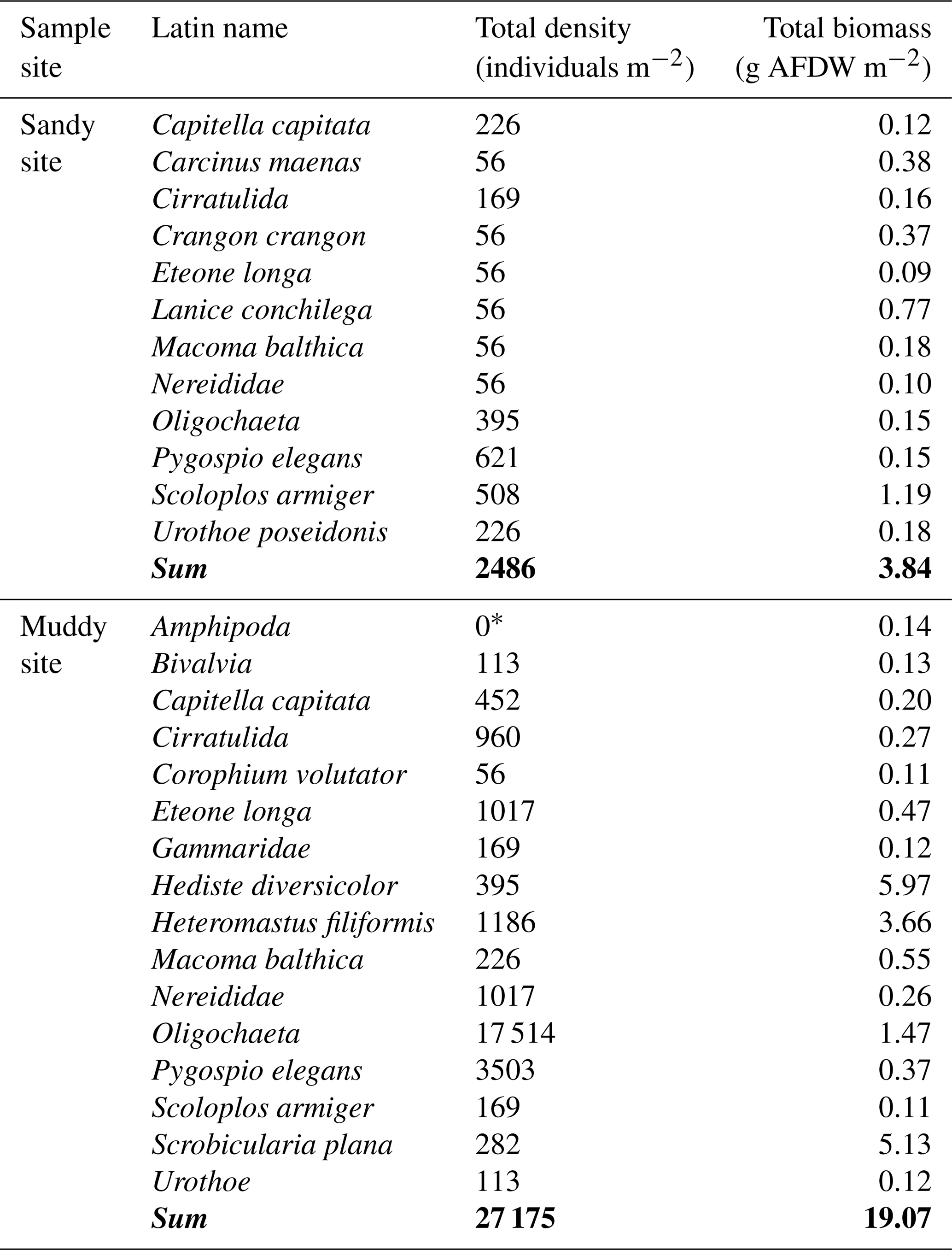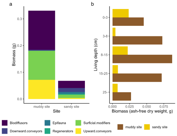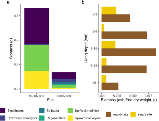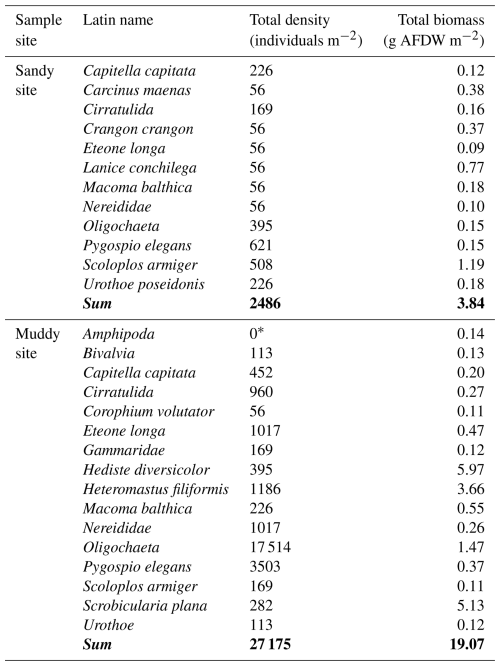 To describe the benthic community, we sampled both sites using a hand corer (surface area of 0.0177 m2), which was pushed into the sediment until encountering the first shell layer (depth approximately 0.25 m). The core sample was sieved over 1 mm mesh size and the remaining coarse fraction including biota was conserved in 4 % formaldehyde, buffered with borax and stained with Rose Bengal (CAS Number: 4159-77-7). In the laboratory, samples were sorted and biota were identified. Next, dry weight (DW) was measured after drying at 60 °C for 2–3 d and ash free dry weight (AFDW) was measured after combustion at 560 °C for 5 h, to yield biomass per taxon. Due to the limited area and depth of our samples and the lower density of larger Arenicola marina individuals, we did not capture this species in our samples. From the field observations of large A. marina casts at the sandy location, we expected this species to dominate bioturbation. Therefore, we also derived A. marina density based on cast counts from pictures from both locations (4 pictures per site). To estimate individual biomass, we actively collected A. marina from both sites with a spade (N=17), which were dried in the same way as the benthic community samples. We derived bioturbation traits and living depth from a trait database (Beauchard et al., 2023) and calculated the total biomass per trait group.