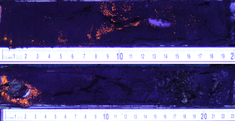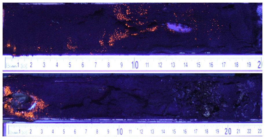 Simultaneous to the long core sampling, we started a luminophore tracer experiment adjacent to both sampling locations. Fluorescent coated luminophores (red/pink tracer, size range: 0–125 µm) were mixed with sieved native sediment from each site (ratio 1:10 for the muddy sediment and 1:17 for the sandy sediment) and applied to the sediment surface as 15 cm × 15 cm × 0.5 cm frozen tiles. Per site, three experimental plots were created by aligning four of these tiles – thus each covering a total area of 30 cm × 30 cm. These were sampled on day 2, 16 and 30 by pushing a PVC tube (diameter 36 mm) at least 20 cm deep into the sediment. The resulting sediment cores (one per plot) were frozen upright. In order to find evidence of recent bioturbation of the fine particles, the frozen cores were sliced in length direction with a tile saw. The cutting surface was scraped clean in lateral direction until the still frozen sediment was reached. If cutting had resulted in visible artefacts in the sediment (cavities or disturbed sediment surface), the damaged core or half core was excluded from analysis, leaving two replicate cores per site per time point. Next, both halves of the core were photographed in a dark room under ultraviolet light, with a ruler for scale reference. The images were processed using ImageJ (Schneider et al., 2012): first, we adjusted the display settings Level ≈ 50 and Window ≈ 100. Red and orange pixels were then identified per 2 cm depth slice by extracting RGB values of each pixel, and applying thresholds (R > 150, G > 40, G < R–30, B < 100). The total count of pixels meeting these criteria was recorded as the red–orange pixel count. The average number of pixels per depth interval were averaged over both core halves.