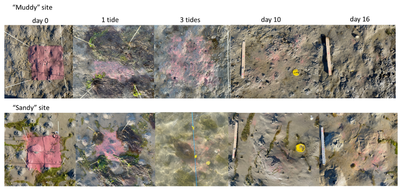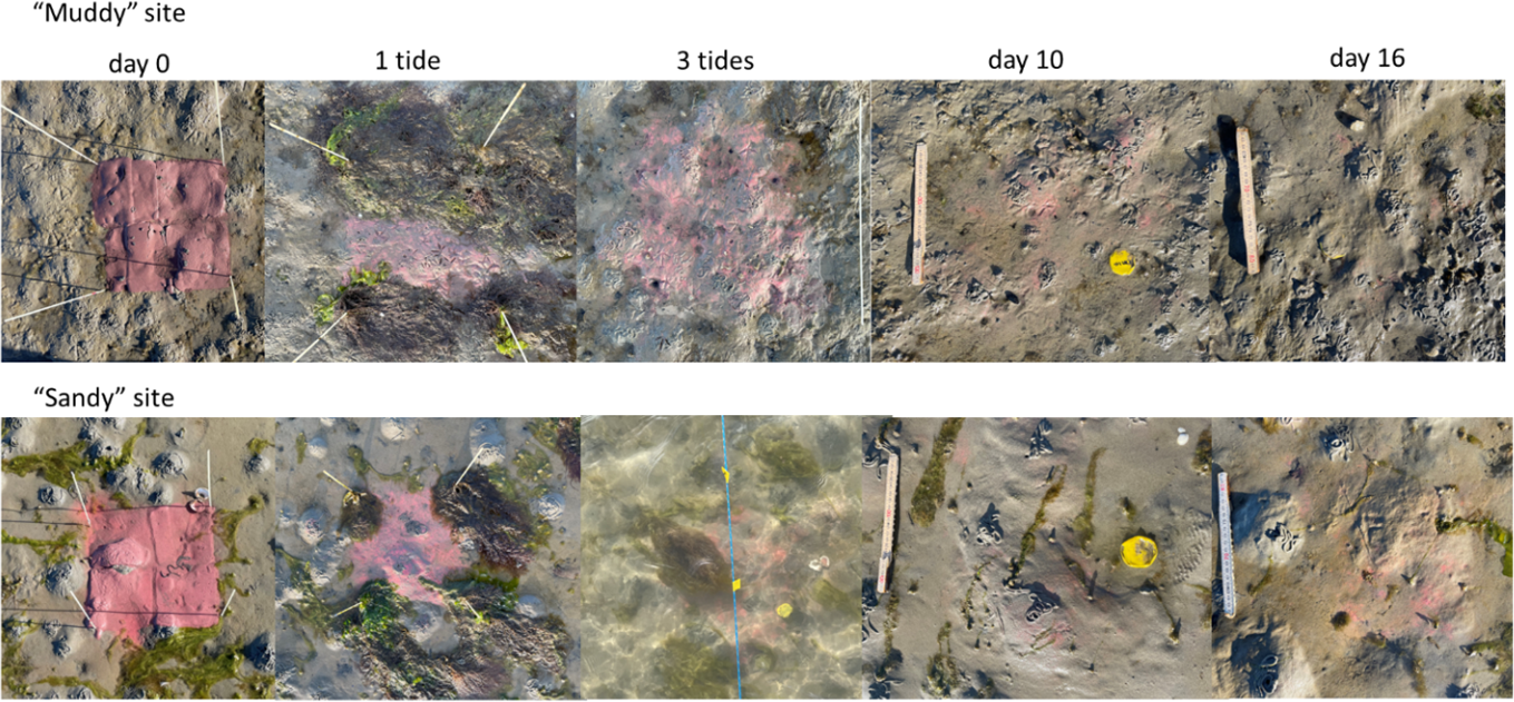 These findings also bear ecological implications. Fine, organic-rich tracers were rapidly carried below the aerobic zone and accumulated at depth, whereas young sand grains were not. This indicates that bioturbation affects reactive compounds more strongly than coarse particles. Its influence on sand transport may thus be smaller than its role in sediment biogeochemistry and carbon storage. By modifying sediment mud content, bioturbators can modify their own habitat conditions. In sandy sediments, preferential reworking of fines can increase subsurface mud content. Such “muddification” by cockles was demonstrated in a flume experiment (Soissons et al., 2019) and by Ensis leei in a field experiment (Witbaard et al., 2017). On the other hand, resurfaced fines may be mobilised from muddy sediments, decreasing the sediment mud content (Montserrat et al., 2009; Volkenborn et al., 2007a; Wendelboe et al., 2013). These two-way processes affect large-scale intertidal flat morphology and sediment composition (Brückner et al., 2021; Le Hir et al., 2007). Finally, the integrated contribution of bioturbation and storms may be comparable when event energy and frequency are considered together. Whereas bioturbation is a continuous process of small particle displacements, storms are infrequent, but high energy events (Fig. 1b). In effect, benthic animals influence daily sediment properties, while storm events “reset” the system. Because most species have a relatively wide sediment tolerance (Kooistra et al., 2025), such episodic resetting does not necessarily result in a major community shift, and during calmer periods, bioturbators can once again modify sediments at smaller scales, potentially enhancing their own habitat suitability.