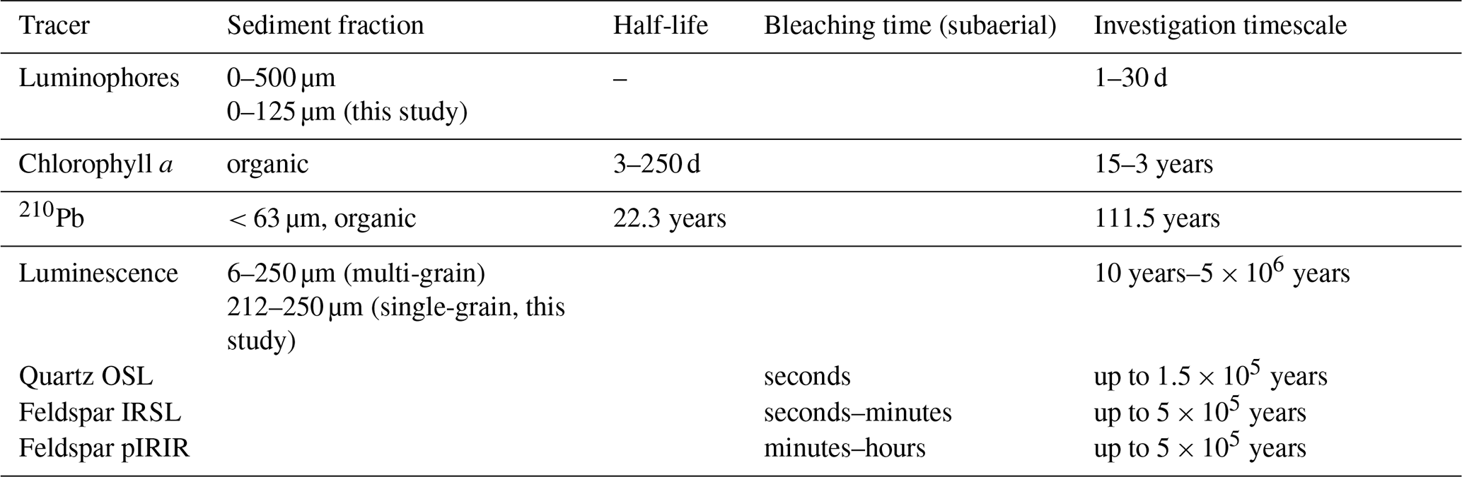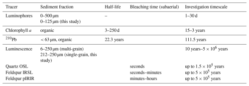 Table 1Tracers used in this study with their target grain size fraction, half-life time (Chl a and 210Pb) or bleaching time (luminescence signals). For the tracers with a half-life time, investigation timescales are 5× the tracer half-life (Lecroart et al., 2010; Meysman et al., 2008). Subaerial estimated bleaching times for luminescence signals are shown (Colarossi et al., 2015; Godfrey-Smith et al., 1988; Smedley et al., 2015).