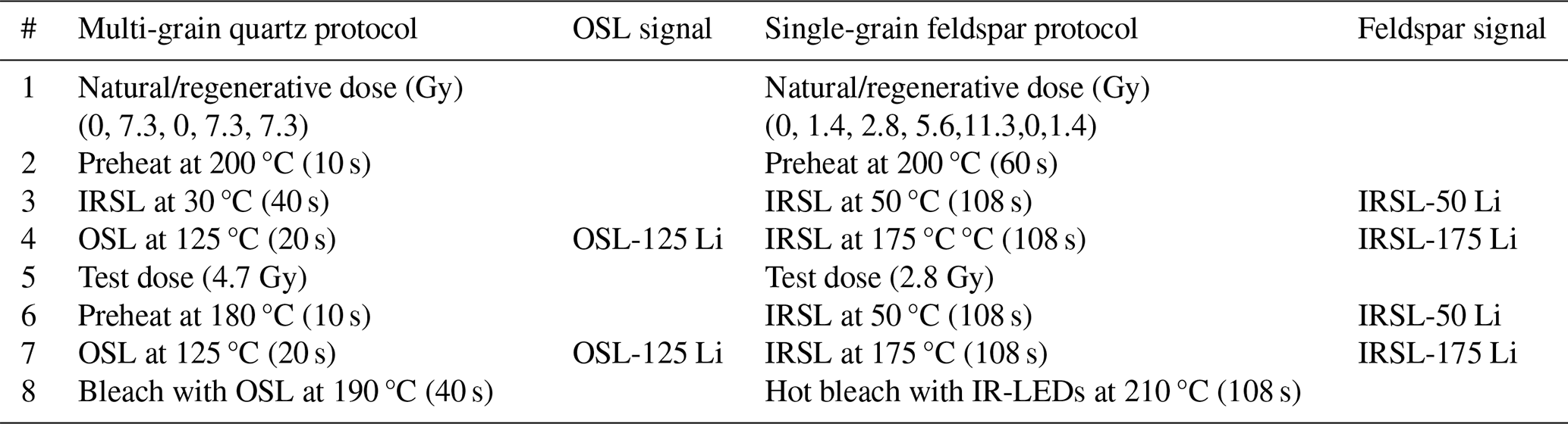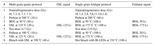 Quartz and feldspar luminescence samples were prepared following a standardised protocol (Appendix A2.1). The multi-grain quartz aliquots (48 per sample) were measured using an automated Risø TL/OSL DA-15 reader, following a Single-Aliquot Regenerative-dose protocol (SAR) (Table 2). The single-grain feldspar measurements were performed using an automated Risø TL/OSL DA-20 reader with an automated detection and stimulation head (DASH) and an EMCCD camera (Kook et al., 2015). A multiple-elevated-temperature (MET) pIRIR measurement protocol was used (Table 2) (de Boer et al., 2024b; Li and Li, 2011). Three single-grain discs per sample were used, resulting in approximately 250 grains measured per sample. For more details on the measurement procedure, see Appendix A2.1.