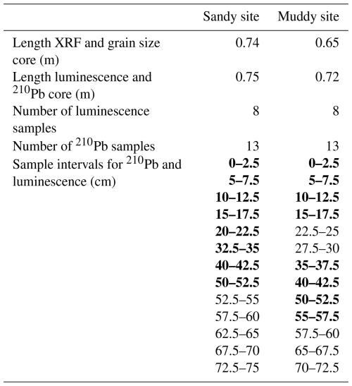 Two replicate sediment cores were collected at each site in August 2023 for grain size analysis, geochemical composition (X-ray fluorescence, XRF), 210Pb and luminescence analysis. The cores were obtained by hammering two PVC tubes (inner diameter 96 mm) side by side vertically into the tidal flat deposits. After extraction from the tidal flat, the cores were sealed and transported to a dark container where under subdued amber-light conditions a core slicer was used to split each core into two halves. One of the cores halves was kept for luminescence and 210Pb sampling, the other was kept for XRF scanning and sediment composition. We subsampled luminescence and 210Pb samples by cutting 25 mm thick slices from the top to the bottom of each core, of which we selected eight per core for luminescence analysis (see Fig. 2 and Table A1 for intervals). The inner portion of each slice was used for luminescence equivalent dose (De, Sect. 2.6.1) estimation and 210Pb analysis, while the outer material was reserved for determining the environmental dose rate (D⋅, Sect. 2.6.2). The sediment was wet-sieved in a dark room environment to separate the grain-size range of 212–250 µm, used for luminescence analysis, from the fraction smaller than 63 µm, used for 210Pb analysis. We measured 210Pb for five additional samples of each core, amounting to a total of 13 210Pb samples per core.