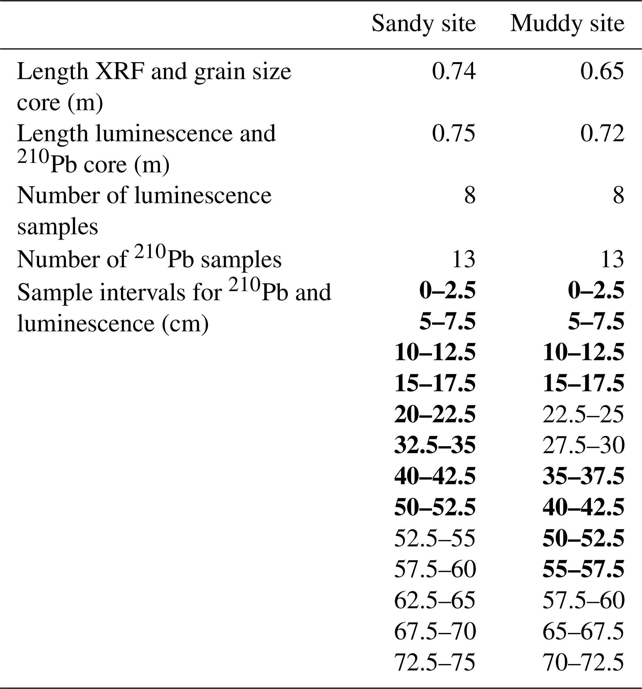 On the muddy site, the top 0.2 m of sediment were gradually deposited, starting approximately 500 years ago. The layer that is now at 0.35 m then fell below the bioturbation depth and was not any longer exposed to light. The sediment has then slowly been accumulating with bioturbation resulting in bleached OSL signals and the formation of a gradually thickening shell layer. Elevated 210Pb activity below the shell layer could be due to passive infiltration of fines through the porous shell layer. The strong break in luminescence age suggests little exchange of sand grains through the shell layer, and thus differential displacement of coarse and fine particles.