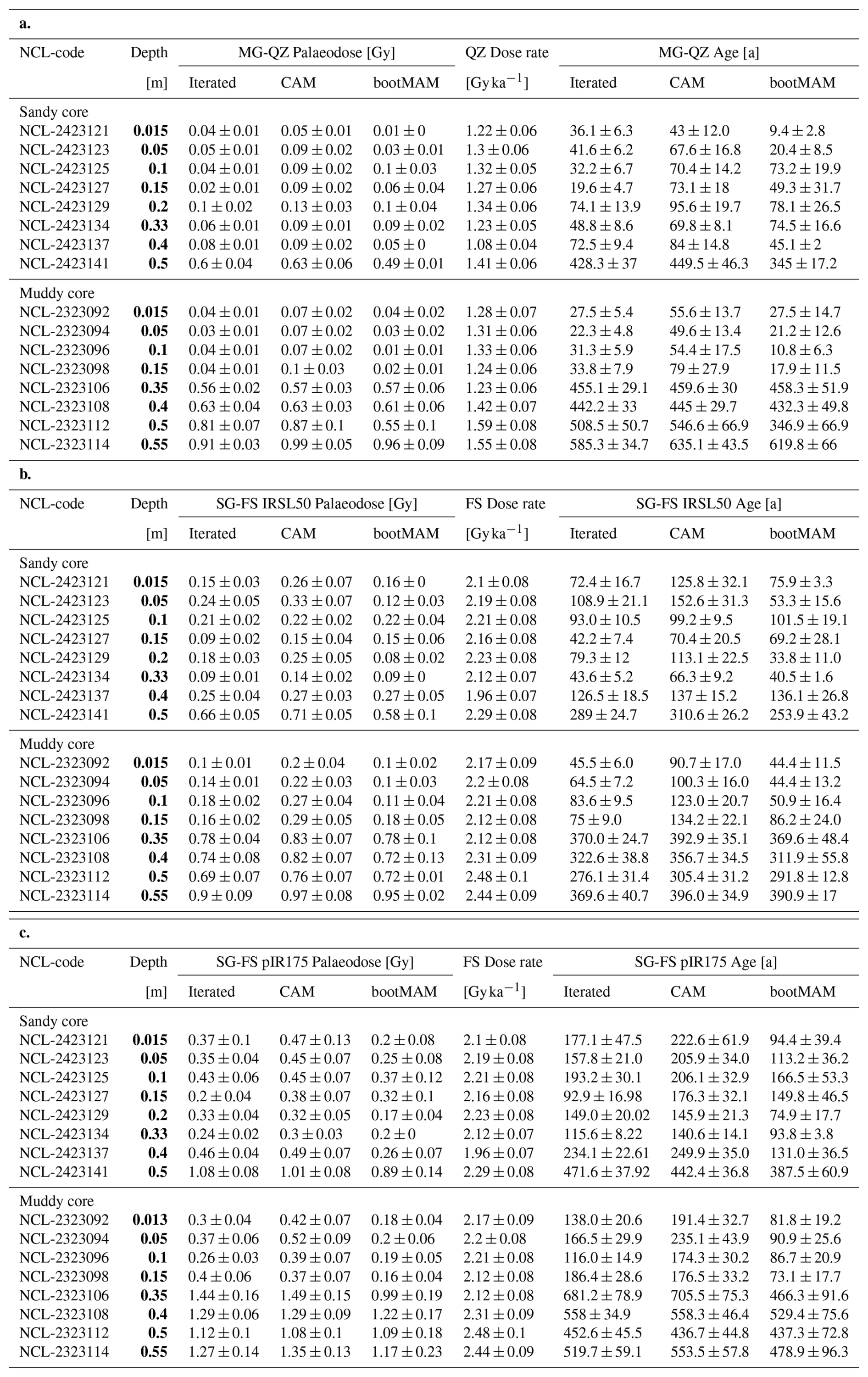 In discussing the luminescence ages, we focus on the quartz OSL ages obtained through the iterated age model; given that quartz OSL resets most rapidly upon light exposure this provides the best estimate of the last light exposure of the majority of the grains. Quartz bootMAM ages indicate the last time of introduction of light exposed grains through bioturbation. For feldspar, heterogeneous bleaching is to be expected due to slower resetting of the luminescence signals and therefore we focus on the interquartile range of the age distribution and bootMAM derived ages to infer information on light exposure and thus process information.