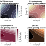 In all crops, precipitation and temperature indicators interacted in defining yields (Table 2). Yields increased between 0.2 t ha−1 per decade for spring crops and 0.5 t ha−1 per decade for winter wheat (Table 2), i.e., 7 % to 10 % of the long-term average. Winter wheat and spring barley yields were maximum or near maximum for combinations of jointly increasing precipitation sums and average temperatures during the (main) growing season (Fig. 4a–b). Yields of spring wheat and oats were maximum at approximately average temperature 14 °C and 7 d CDD (Fig. 4c–d). The yield maximizing temperatures decreased with increasing CDD.