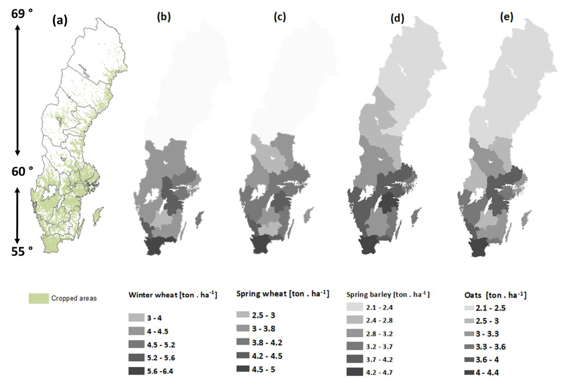 Figure 1Overview of the study area including (a) the location of cropped areas in green and (b–e) the average yields of each of the four crops for each county in Sweden during the period 1965–2020. Only the counties corresponding to the regions where these crops are cultivated are reported, i.e., only to latitudes of approximately 61° N for winter and spring wheat.