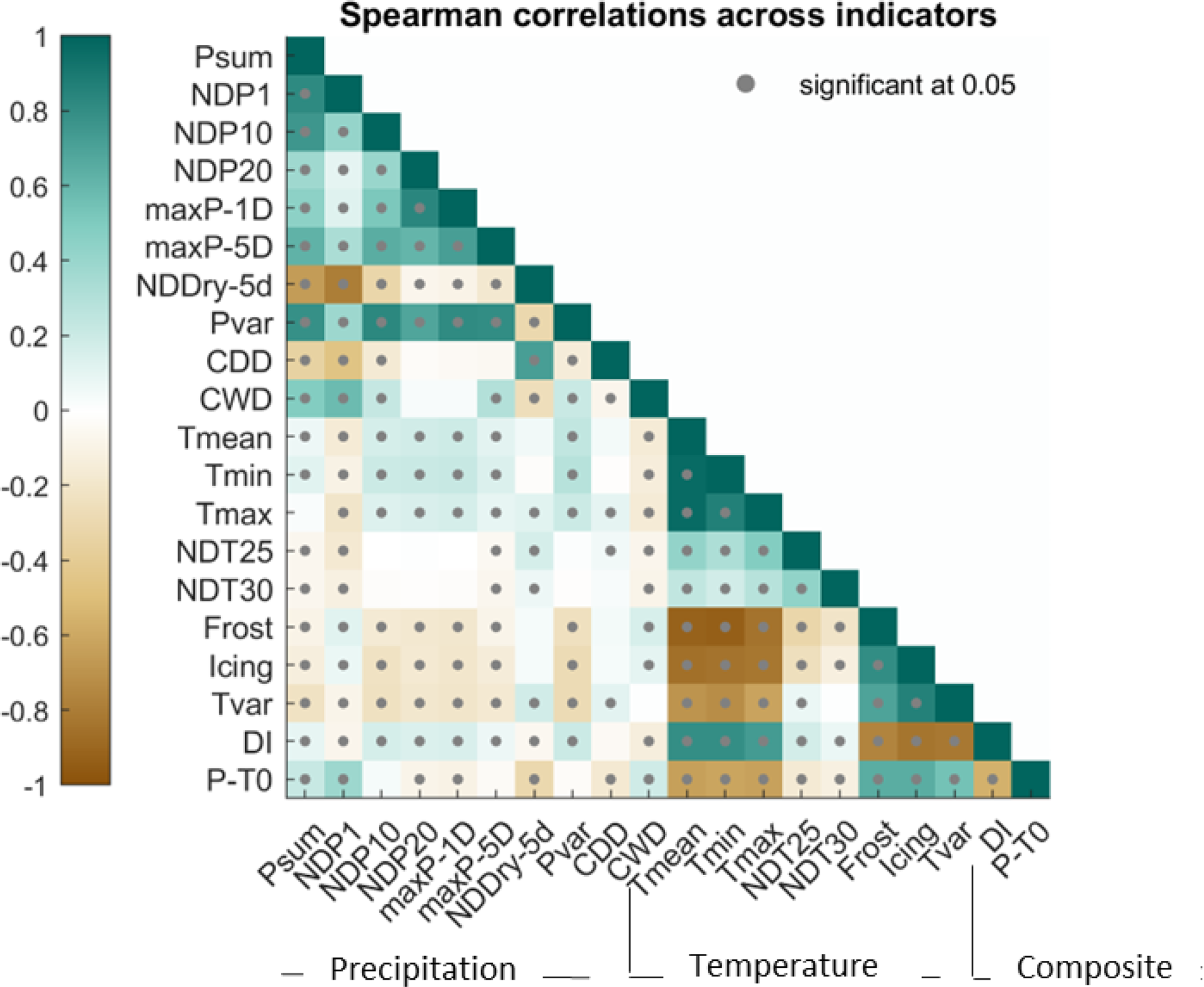 Figure 2Spearman correlation between pairwise indicators representing magnitude, variation and duration of precipitation and temperature, as well as two composite indicators over the entire growing season (see Table 1 for indicator definitions and Sect. 2.2.2 for the definition of periods). The significant correlations (p<0.05) are marked with a grey circle. The figure refers to the main growing season of winter wheat for all indicators except the composite indicators DI and P-T0, which refer to the pre-growing period. Similar patterns were observed when considering spring crops and sub-periods.