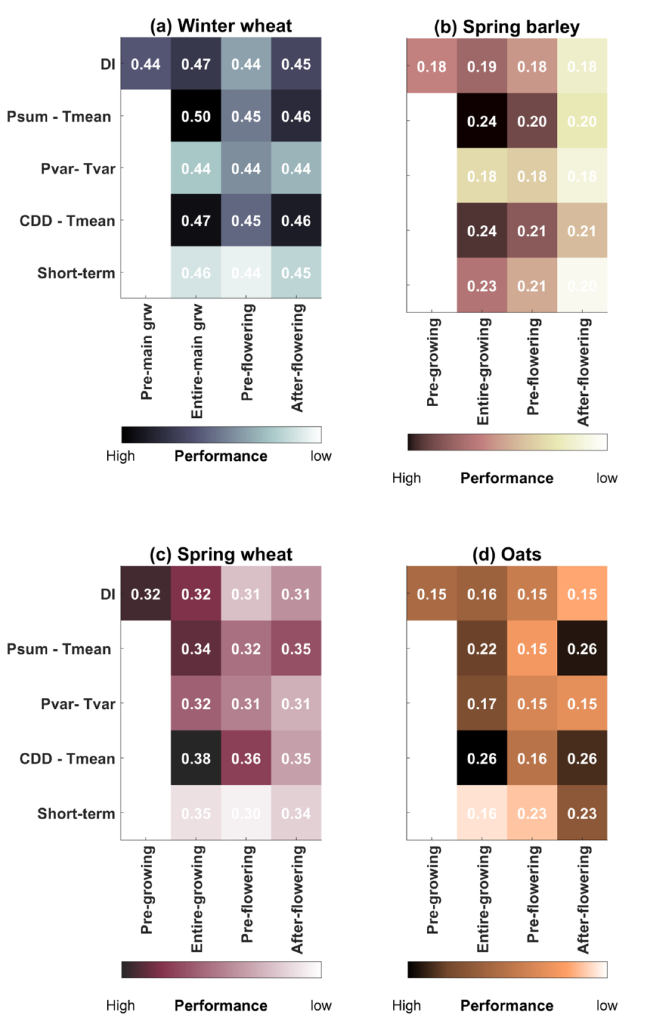 Conditions relative to the entire (main) growing season had the highest performance for all crops according to the AIC. Models based on post-flowering conditions for winter wheat (Fig. 3a) and oats (Fig. 3d), pre-flowering conditions for spring barley (Fig. 3b), and pre-growing dryness index for spring wheat (Fig. 3c) had the second best performance. However, despite a higher AIC, these models explained a fraction of the variance comparable with the models of the entire growing season, for a given set of indicators. The difference in marginal r2 was 2 to 10 % depending on the crop (Fig. 3).
