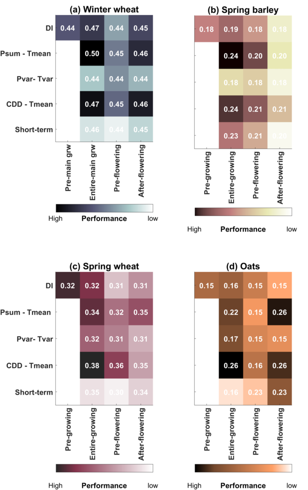 Figure 3Performance of statistical models for yields differing in explanatory variables and period, for four crops (a) winter wheat (b) spring barley (c) spring wheat and (d) oats. Performance is assessed based on the AIC. The darker the color the lower the AIC and hence the higher the performance. Values in each cell indicate the corresponding r2marg for each model, representing the fraction of variance explained by climatic conditions and time. Duration of the pre- (main) growing season is 2 months for spring wheat and 3 months for other crops. Short-term conditions refer to the model combining additively two precipitation indicators (NDP1, NDP20) and two temperature indicators (NDT25, Frost). For a full list of abbreviations, see Table 1.