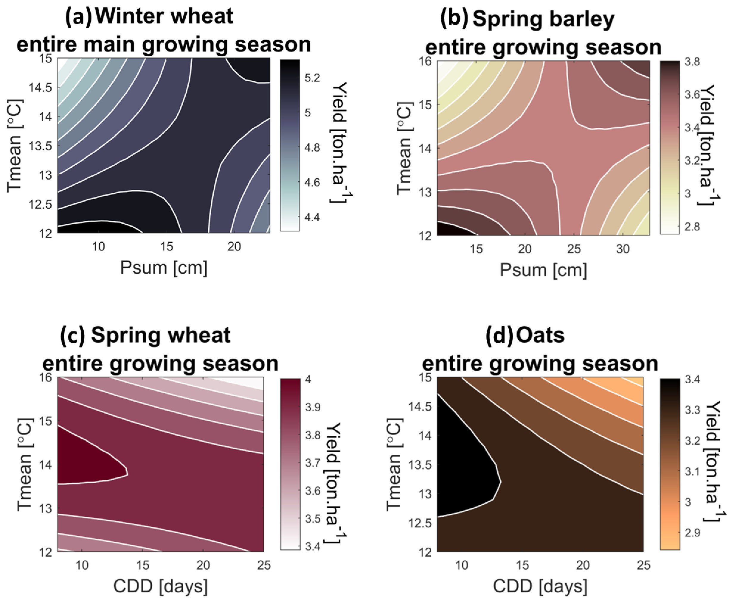 Figure 4Crop yield as a function of best performing set of climatic indicators. (a) winter wheat, (b) spring barley, (c) spring wheat, (d) oats. Winter wheat and spring barley were best explained through precipitation sum (Psum) and temperature averages (Tmean) of the entire growing season, while spring wheat and oats were best explained through CDD and Tmean of the entire growing season. The contour plots are based on the fixed parts of the statistical models estimated for each crops separately. Time is set to the year 1992 which is an intermediate year within the study period (1965–2020). The ranges of the climatic indicators correspond to the 5th and 95th percentiles of each indicator.