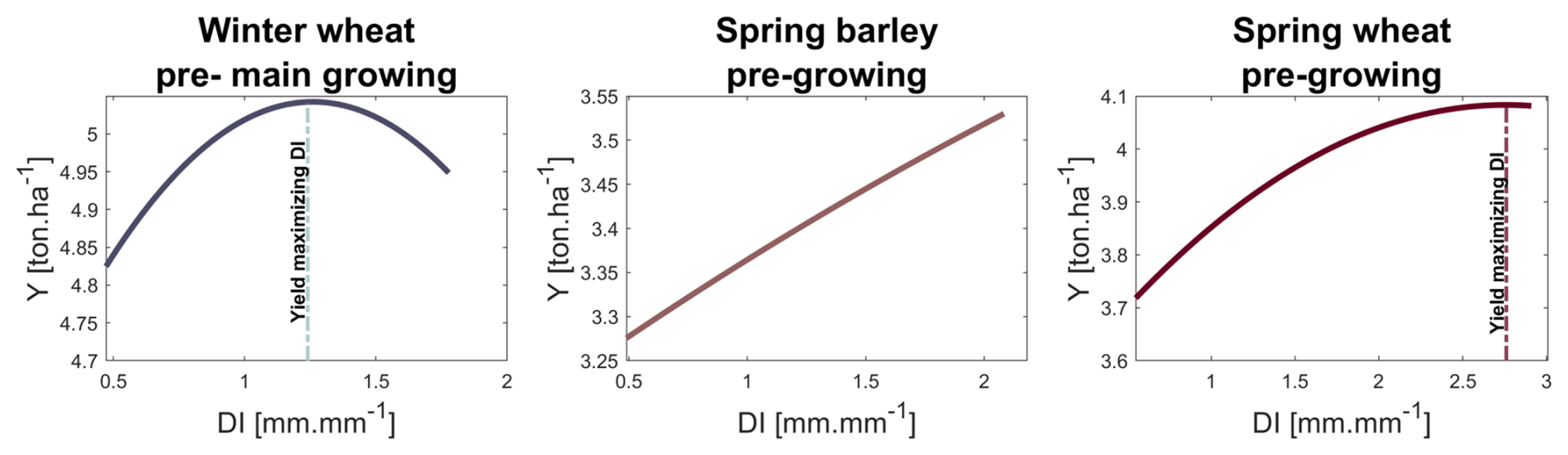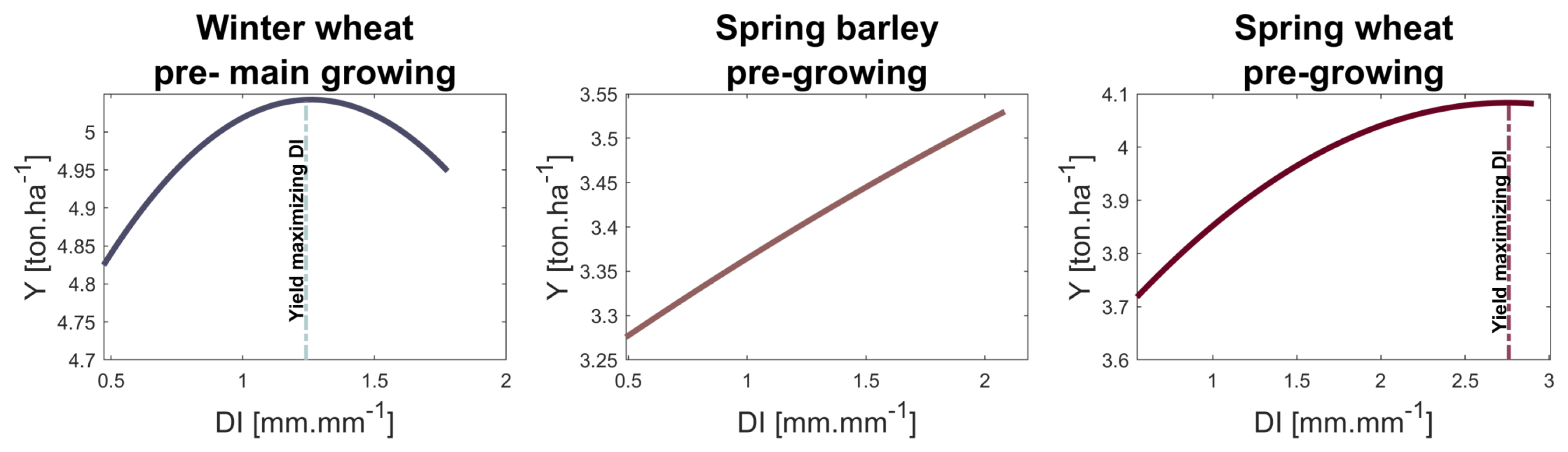 Yields of all crops except oats depended non-linearly on the pre-(main) growing dryness index (DI, Table 3). The yield maximizing DI was 1.2 mm mm−1 for winter wheat and 2.7 mm mm−1 for spring wheat (Fig. 5a, c) – corresponding to the 60th and 90th percentiles of the observed range respectively. Spring barley yield also depended non-linearly on DI, but the yield maximizing DI was above the 95th percentile of the observed range (Fig. 5b). For oats pre-growing proxy of water availability did not affect yield (Table 3d).
