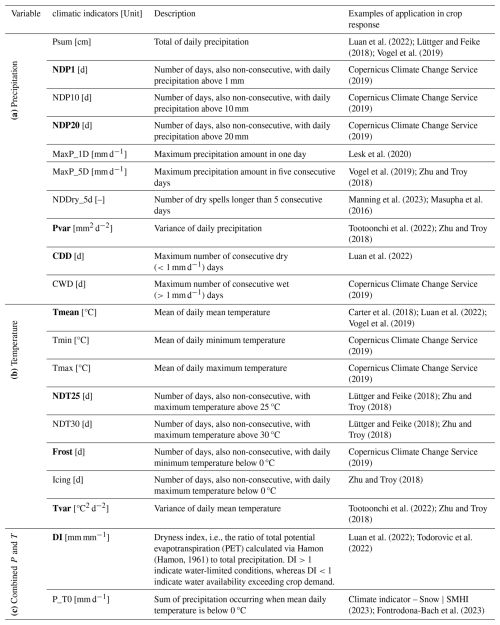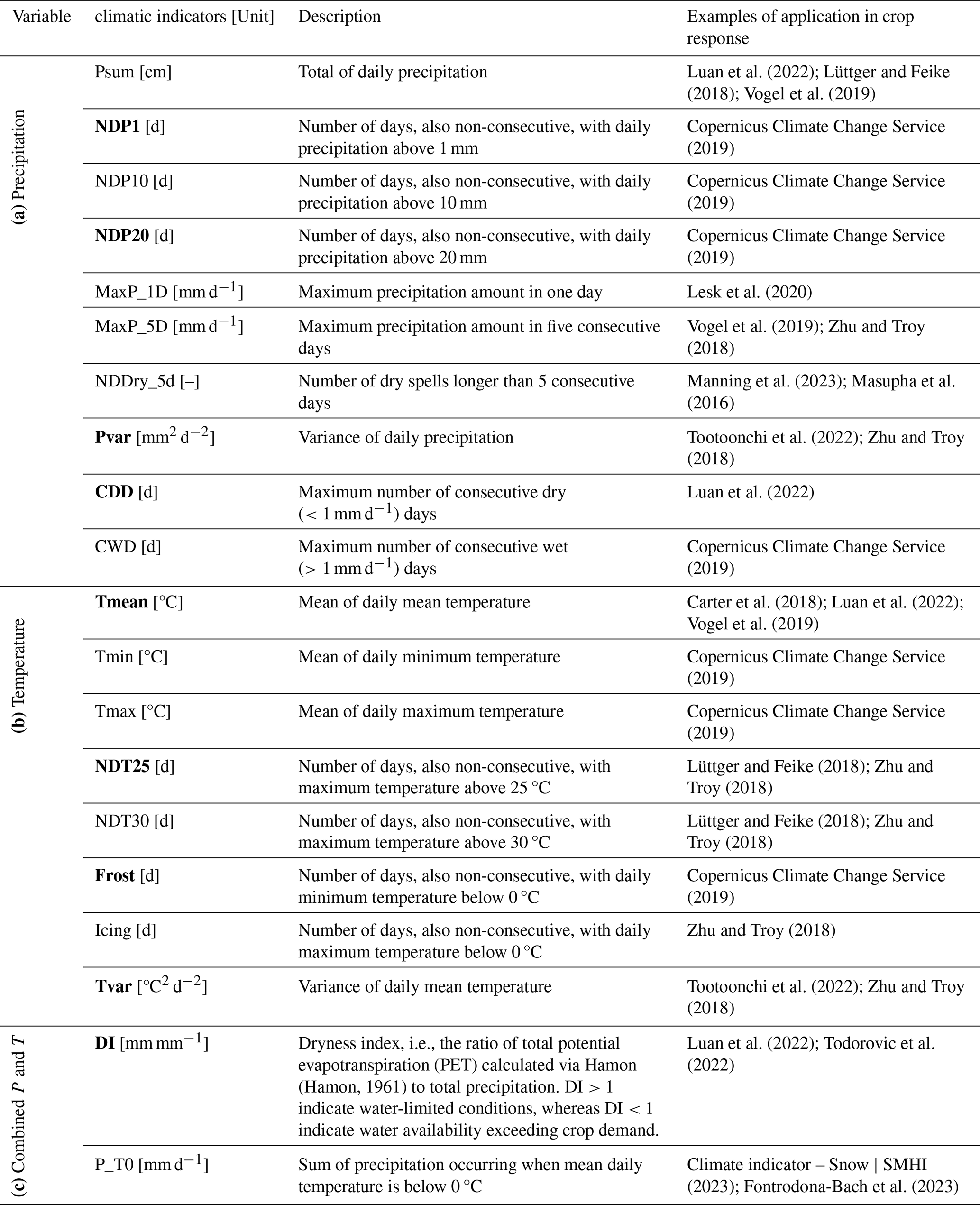 Climatic conditions during a period can be summarized via a variety of climatic indicators (McMillan, 2021; Schmidt and Felsche, 2024; Wiréhn, 2021; Zhu and Troy, 2018). These are “simple diagnostic quantities that are used to characterize an aspect of a geophysical system” (Schneider et al., 2013), such as states, variability, or frequencies of climatic conditions (Wiréhn, 2021). Selecting the most suitable indicators is challenging and depends on the purpose, regional climate, and most critical climatic conditions (Adger, 2006; Wiréhn, 2021). A systematic exploration of a wide range of relevant climatic indicators is essential to identify the most relevant indicators to explain crop yields.