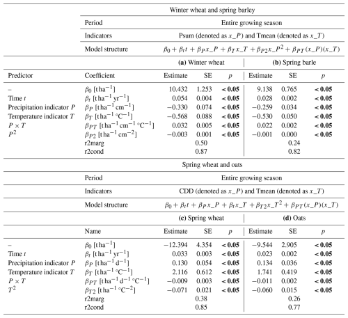 Table 2Best performing combination of model, climatic indicators and period for each crop (a–d) and associated estimated coefficients, standard error (SE) and p. For each model we report also the fraction of explained variance when using only the fixed effects (r2marg) and when using both fixed effects and random effects (r2rand). Cases for p<0.05 are highlighted in bold.