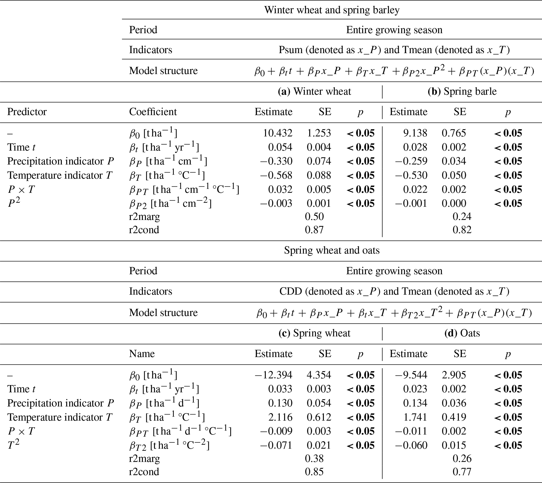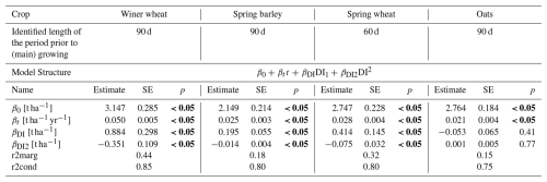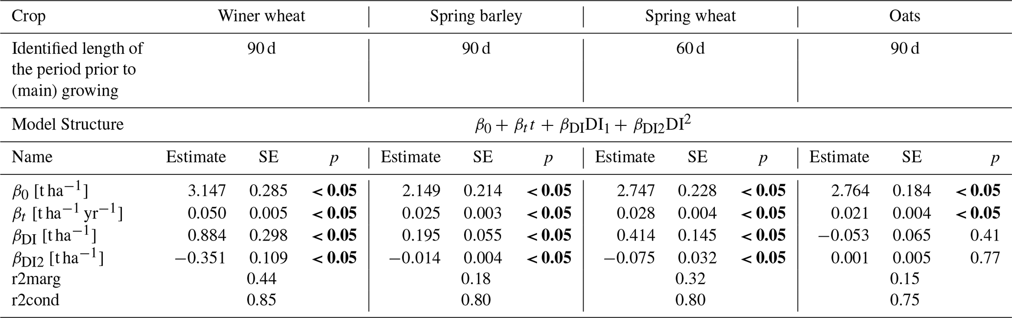 Table 3Model representing the legacy effects of water availability during pre-main growing period for winter wheat and pre-growing period for spring cereals. The table has the identified length of the period prior to (main) growing, model structure, estimated parameters and their units. Each model also included the fraction of explained variance when using only the fixed effects (r2marg) and when using both fixed effects and random effects (r2rand).