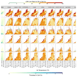 We enabled visualisation of the results by collapsing the eight-dimensional input space into two-dimensional “fingerprints” via grouping the cells based on only two input variables at a time. We present plots of these fingerprints with Tair as one dimension and the other variables as the second dimension in turn. Tair was chosen as the constant x axis because it is intuitively easy to understand, has clear relationships with other meteorological variables, and its domain space is relatively uniformly represented by the site-timesteps, as opposed to the zero-dominated shortwave radiation for instance. Thus, we have two-dimensional fingerprints consisting of cells for which we calculated the LLR. We do not present the fingerprints for Qair because Qair and VPD are highly coupled.