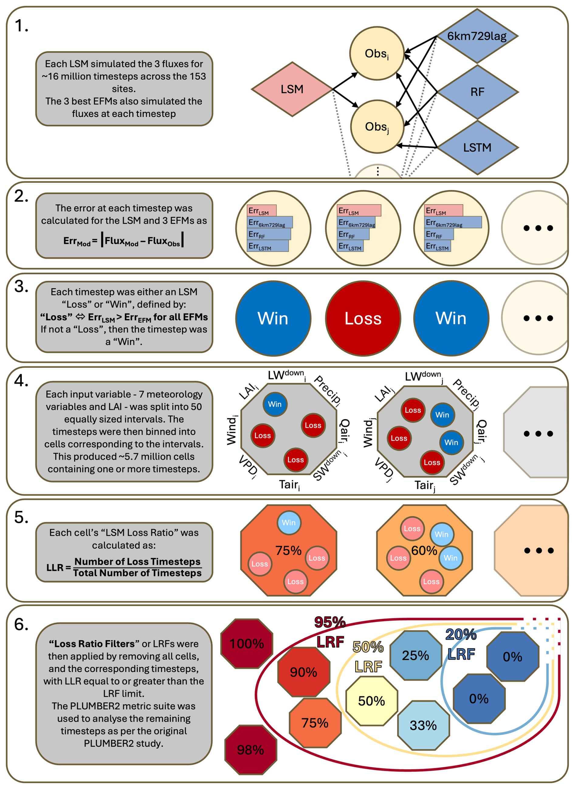 for each LSM and the three best EFMs (step 2 in Fig. 1). We then defined an individual timestep as being a “LSM Loss” (LL) if and only if the absolute error of the LSM was greater than the absolute error of each of the three best EFMs: