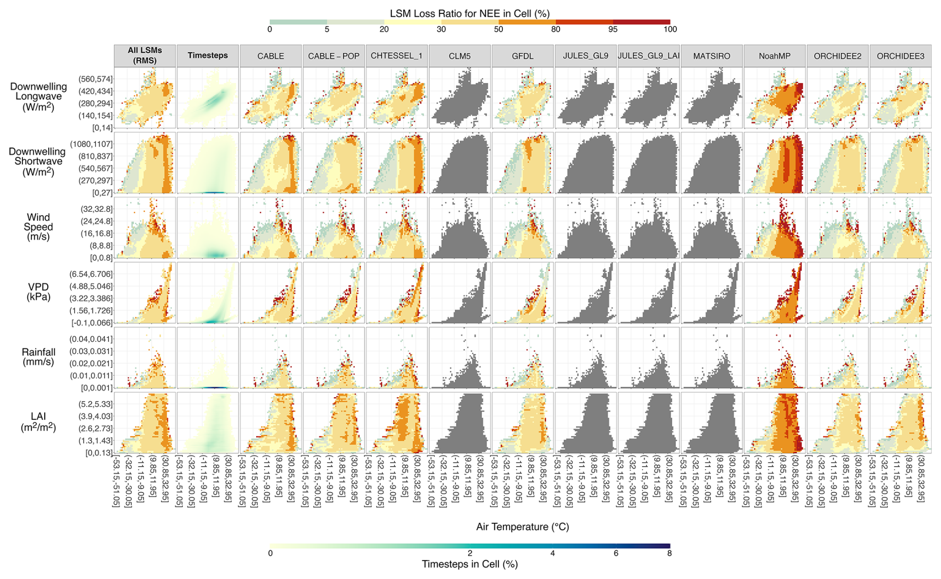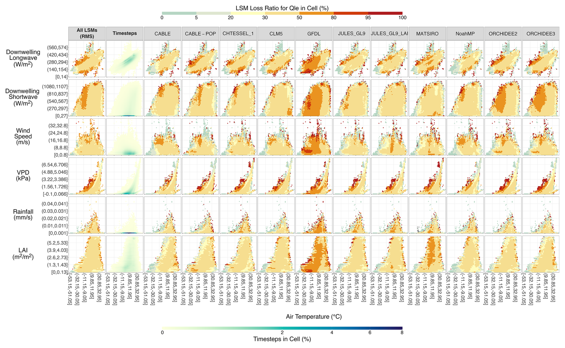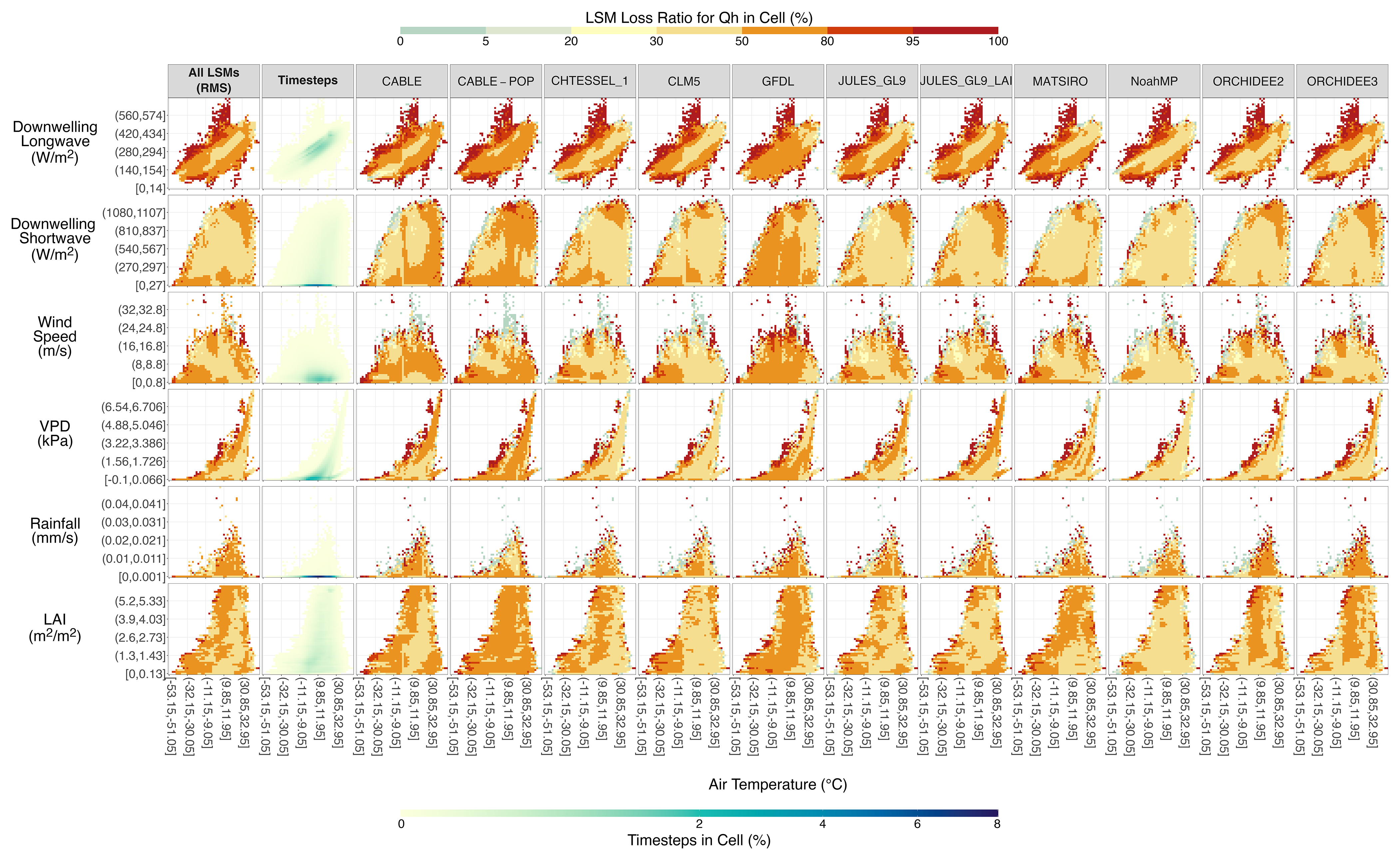 Figure 2LSM Loss Ratio by Driving Variable and Model for Predicting Sensible Heat Flux. The x axis of each plot is air temperature and the y axis the other variables, each split into 50 equal-sized bins of which only every 10th bin is labeled. For the columns of individual models, each cell is coloured by the LSM Loss Ratio, the percentage of timesteps within the corresponding 2-D variable cell that are classified as an LSM Loss for the Qh flux. An LSM Loss of 0 occurs where, for every timestep within the cell, the LSM's absolute flux error is smaller than at least one of the absolute flux errors of the three best EFMs. Conversely, an LSM Loss of 100 occurs when the LSM's absolute flux error is greater than all three absolute flux errors of the best EFMs for all timesteps in the cell. For the timesteps column, the colour indicates the percentage of the total number of timesteps that fell within the 2-D variable cell. The “All LSMs” column is coloured by the root mean square of the LSM Loss across all models. Note that since all models simulated the same site-timesteps, the cells and timesteps within each cell are approximately the same but not equal for every model (some LSMs did not submit simulations for every site, missing four sites at most).
