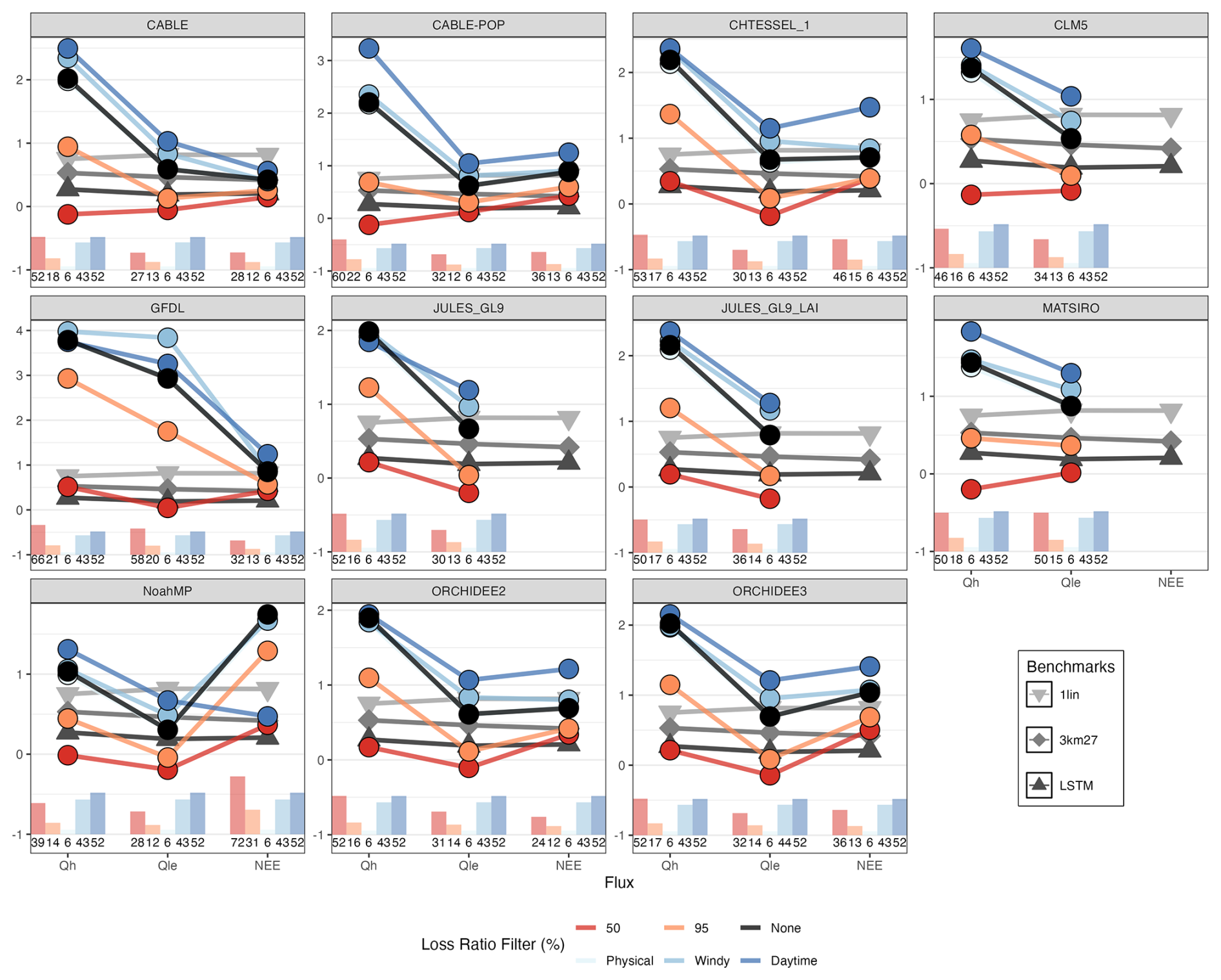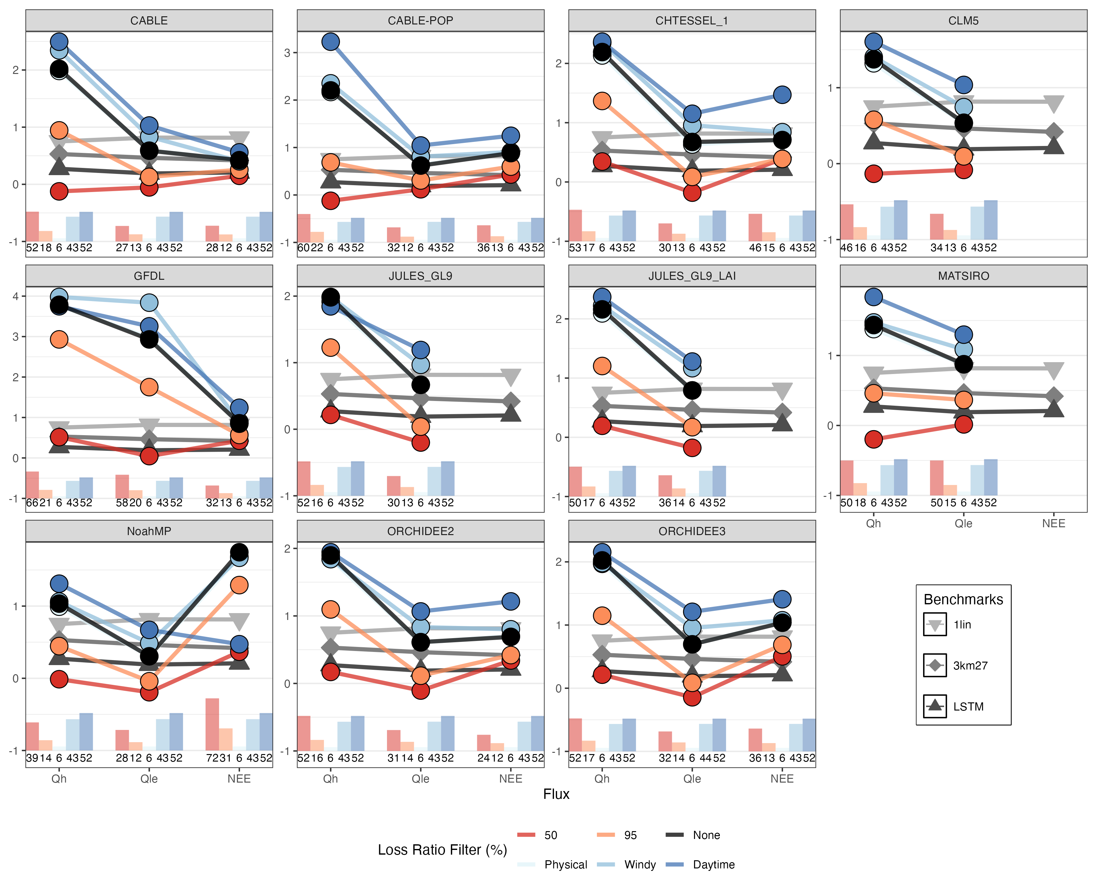 Figure 5 shows the independent normalised metric values (iNMV) for each LSM defined by the range of metric values of the three benchmark EFMs. This is a measure of LSM performance based on the benchmark EFM performance, directly comparable across LSMs (note the differing y axes). The grey lines indicate the 3 PLUMBER2 benchmark EFMs – 1lin, 3km27, and LSTM – with different symbols to differentiate between the EFMs and darker greys as the complexity increases. The black line is the base LSM performance. The blue lines are the LSM results when filters were applied, either using only daytime timesteps (dark blue), timesteps with sufficient wind (mid blue), or timesteps that did not violate physical humidity limits (light blue). The orange (95 %) and red lines (50 %) are the LSM results when timesteps are filtered based on the LSM Loss Ratio. In all cases, iNMV was calculated using the benchmark metrics as calculated on the original dataset i.e. no filters were ever applied to the benchmark models – their iNMV values are always calculated on the entire dataset. The black lines indicate the raw LSM performance as in the PLUMBER2 benchmarking framework and are therefore almost exactly the same result as Abramowitz et al. (2024) (there are slight differences due to using one less site here). As per Abramowitz et al. (2024), LSMs mostly performed worse than the benchmark EFMs, with all 11 LSMs performing worse than a simple linear model for simulating Qh. Better performance was seen in the other two fluxes, with most LSMs' performance falling between the linear model and the “3km27” k-means clustering model for Qle. For NEE, three of the seven LSMs in this analysis beat the linear model performance.