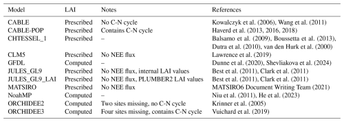 Table 1Land Surface Models included in this study. “No NEE flux” here refers only to the necessary 30 min outputs required for this analysis – the model may produce NEE simulations at a larger timestep.