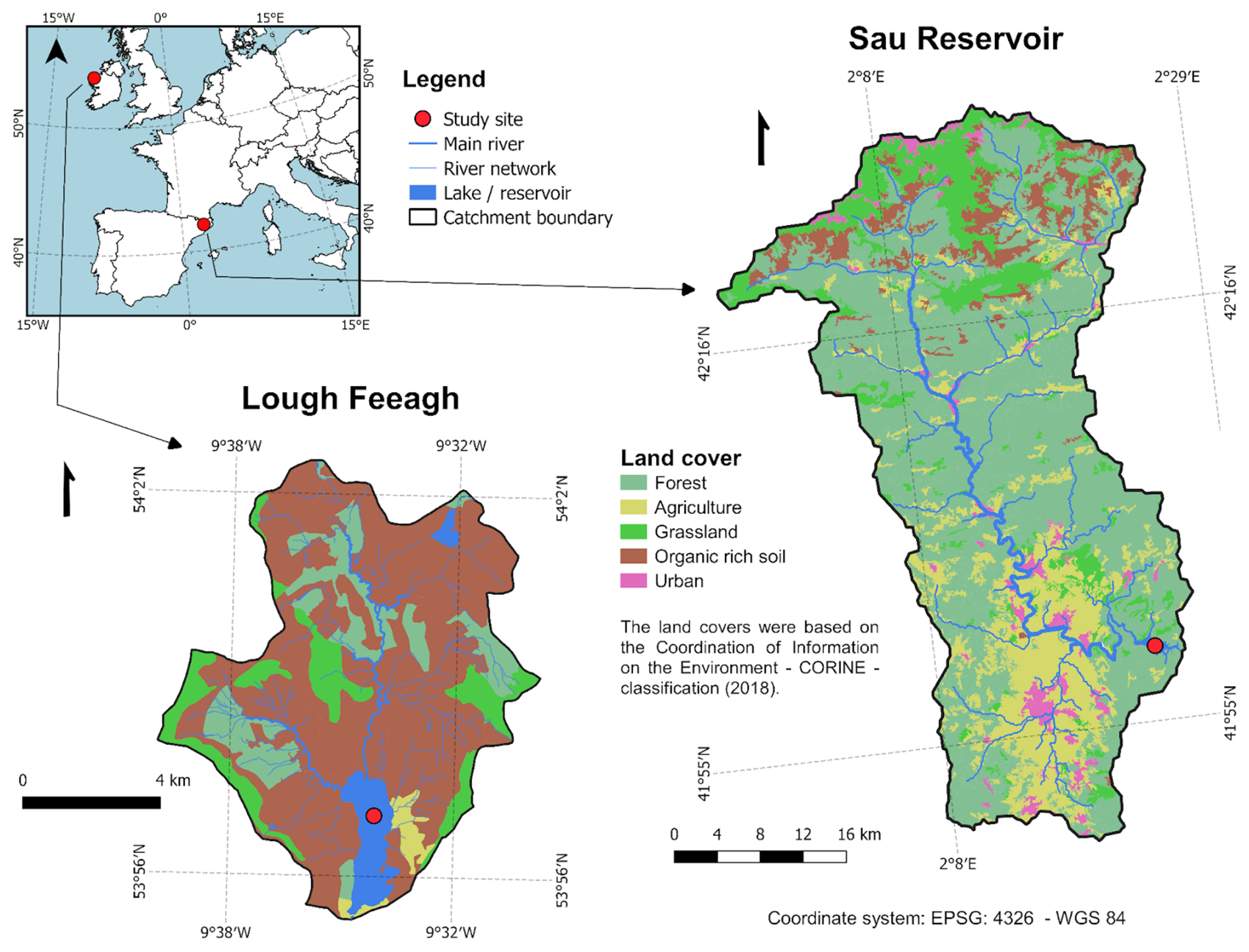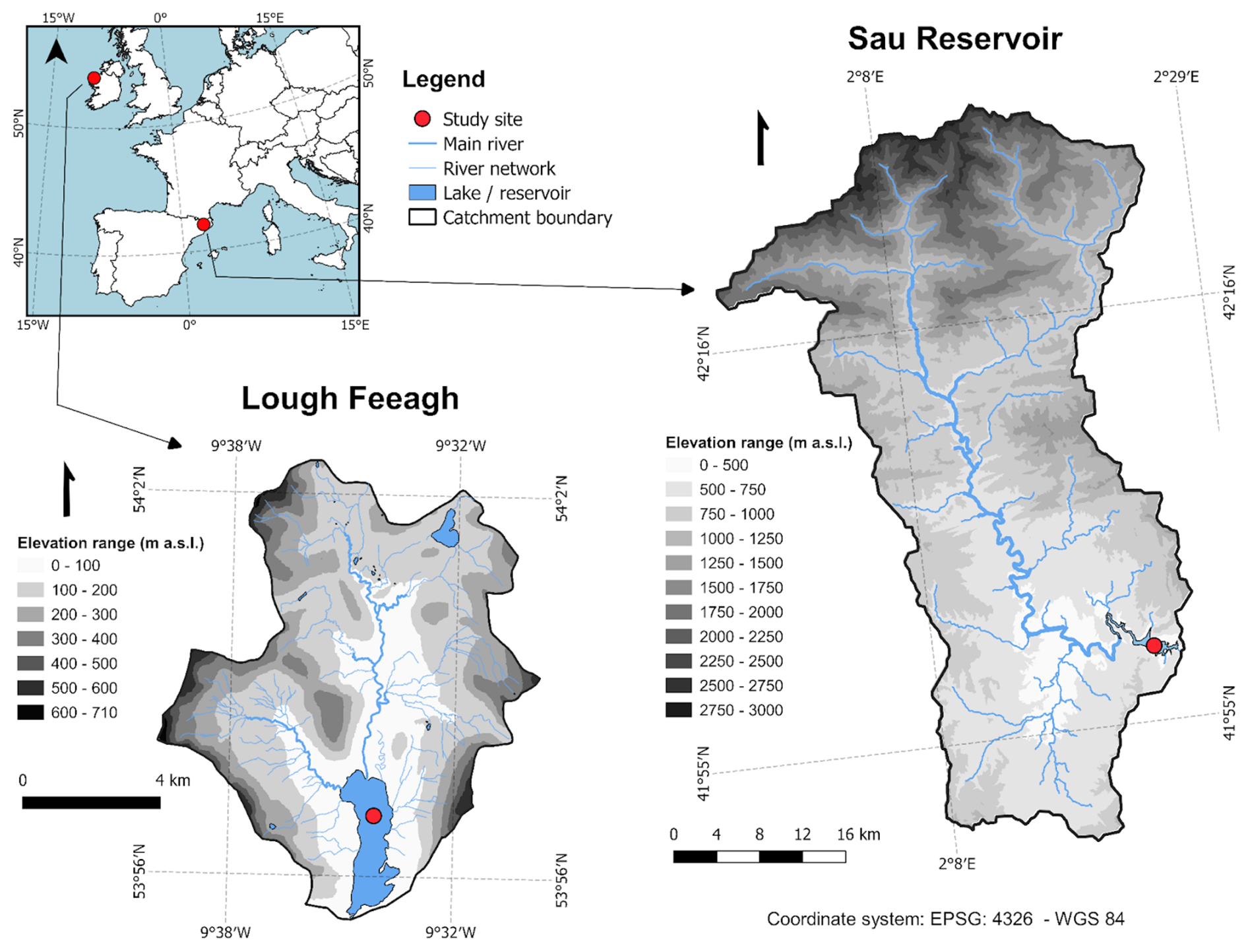 Lough Feeagh and Sau Reservoir are located in western Ireland (53°56′ N, 9°35′ W) and northeastern Spain (41°58′ N, 2°23′ E), respectively (Fig. 1). The study sites have contrasting attributes. Feeagh (depth of 46.8 m and area of 3.95 km2) is a monomictic and oligotrophic lake surrounded by a relatively undisturbed landscape, while Sau (depth of 70 m and area of 5.8 km2) is an eutrophic system subjected to human activities and water abstraction. Feeagh has two primary inflows, the Black and the Glenamong rivers, while Sau has one, the Ter river. The catchment of Feeagh is relatively small (84 km2), with mid-range hills, and dominated by peatland. The catchment of Sau, in contrast, is larger (1525 km2), with a varying topography and land uses (Figs. 1, A1).