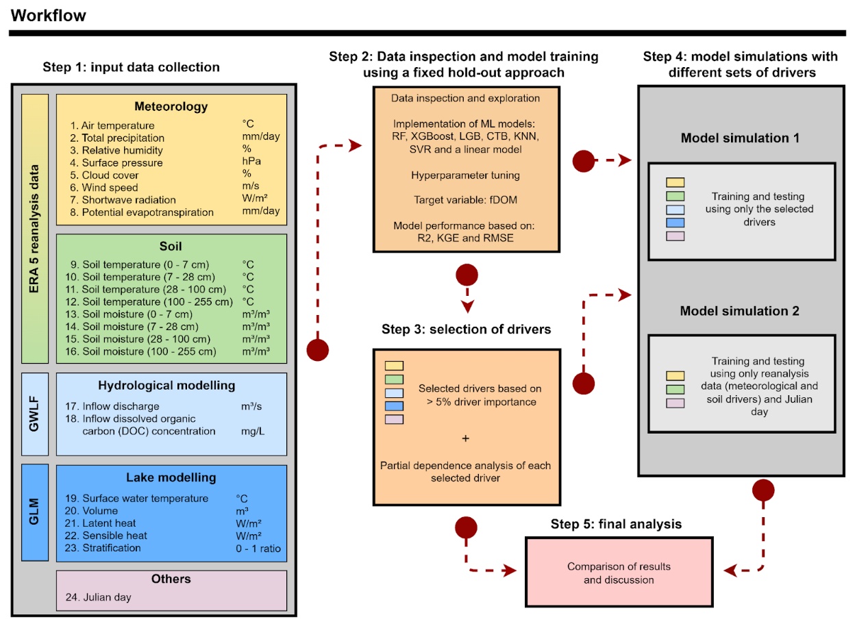 A five-step workflow was implemented to predict fDOM at each site (Fig. 2). First, all potential drivers for fDOM were collected as input data for each site. Second, an exploratory data analysis of fDOM was implemented and the ML models were trained using 85 % of the available time series data (1978 out of 2328 fDOM measurements for Feeagh, and 653 out of 769 for Sau), while the remaining 15 % (350 out of 2328 for Feeagh, and 116 out of 769 for Sau) future time series (hold-out period) was reserved for independent testing to evaluate performance and potential overfitting by comparing with the training period.