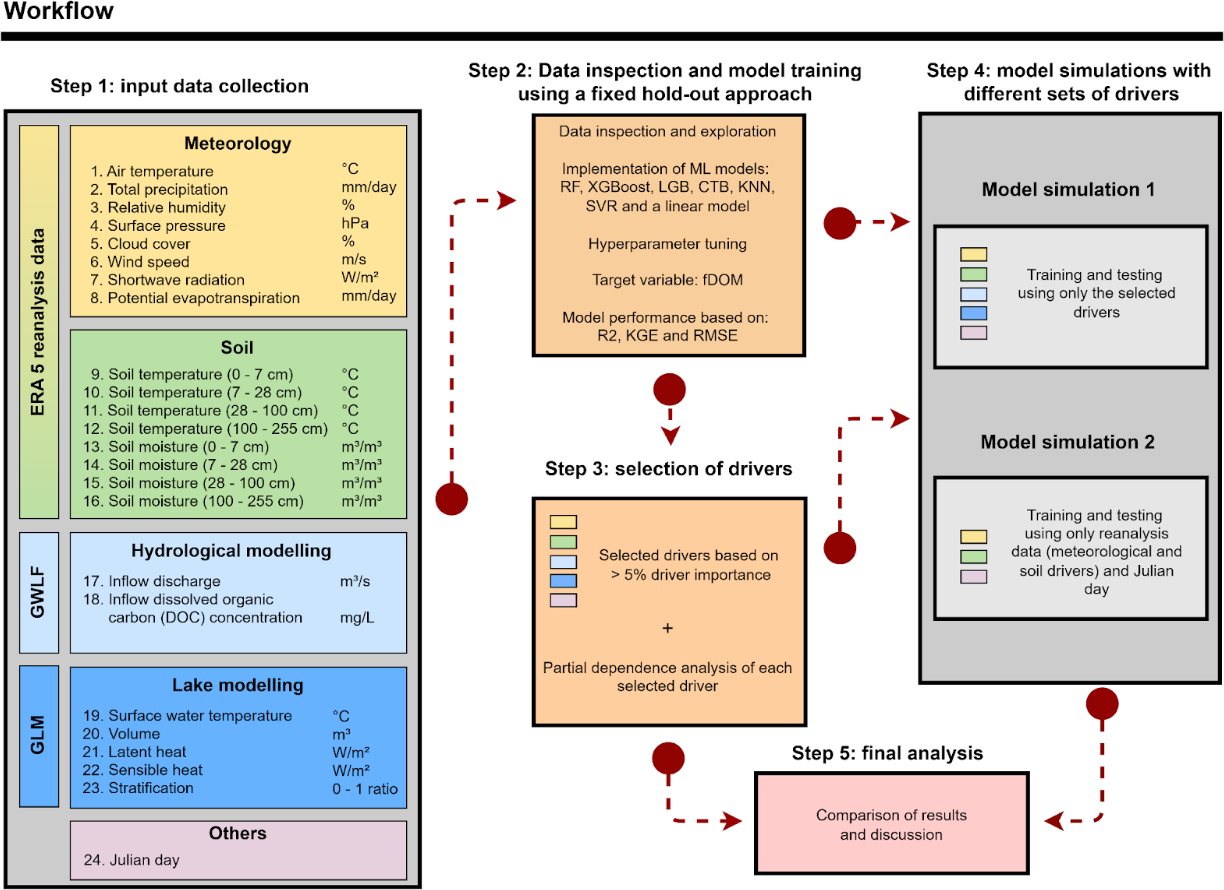 Figure 2The workflow includes five steps: (1) compilation of input variables including meteorology (yellow) and soil (green) reanalysis data from ERA5 (the fifth-generation atmospheric reanalysis product produced by ECMWF), The Generalised Watershed Loading Functions Model (GWLF) outputs (light blue), The General Lake Model (GLM) outputs (blue), and Julian day (light magenta); (2) data inspection and model training using a split between training (85 %) and testing (15 %) periods; (3) selection of influential drivers based on feature-importance metrics; (4) model simulations using selected drivers and a reduced subset based on globally available reanalysis variables and Julian day; and (5) comparison of model outputs. DOC stands for Dissolved Organic Carbon. The workflow is available at: https://doi.org/10.5281/zenodo.19354955 (Mercado-Bettín, 2026).
