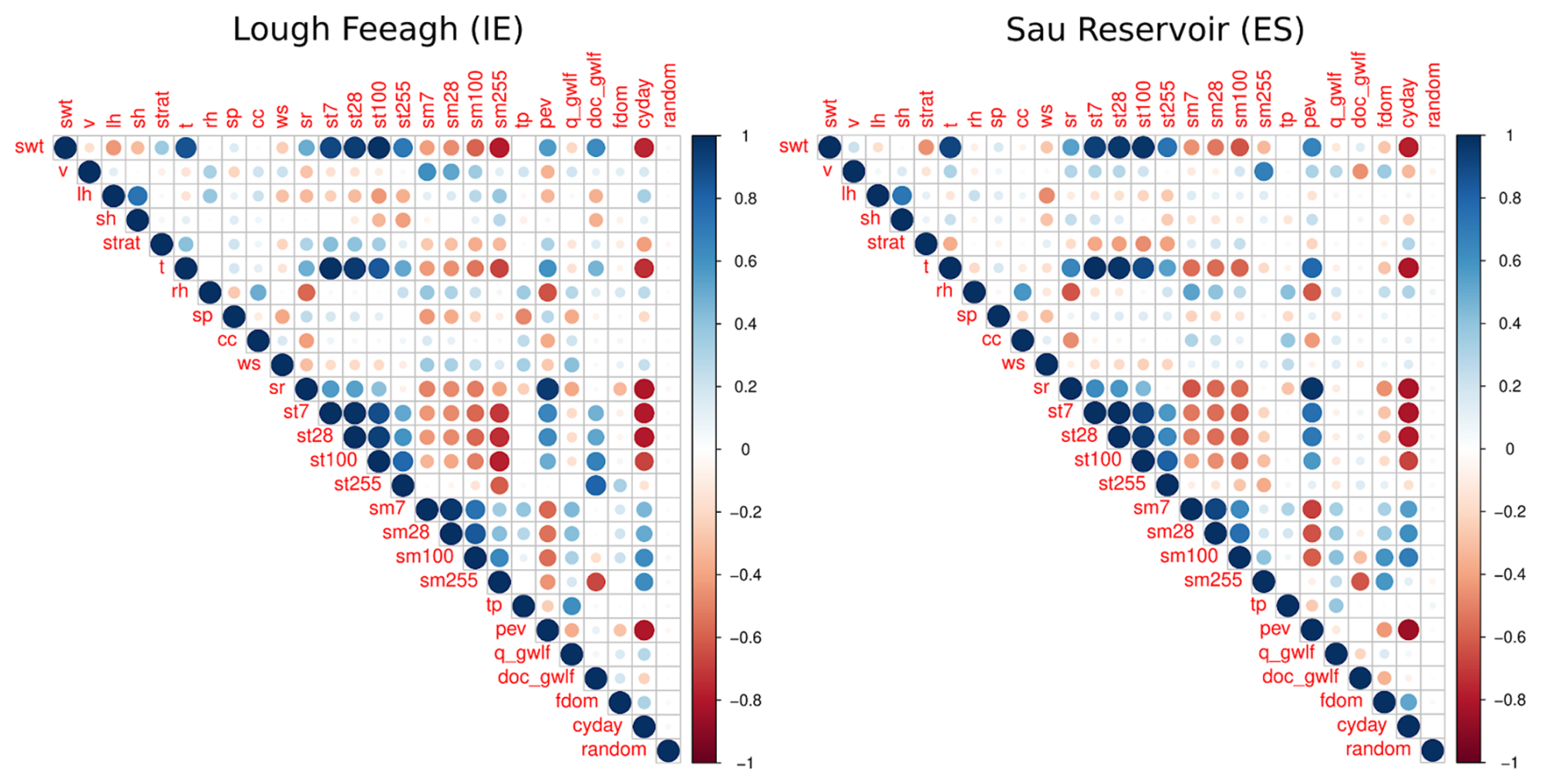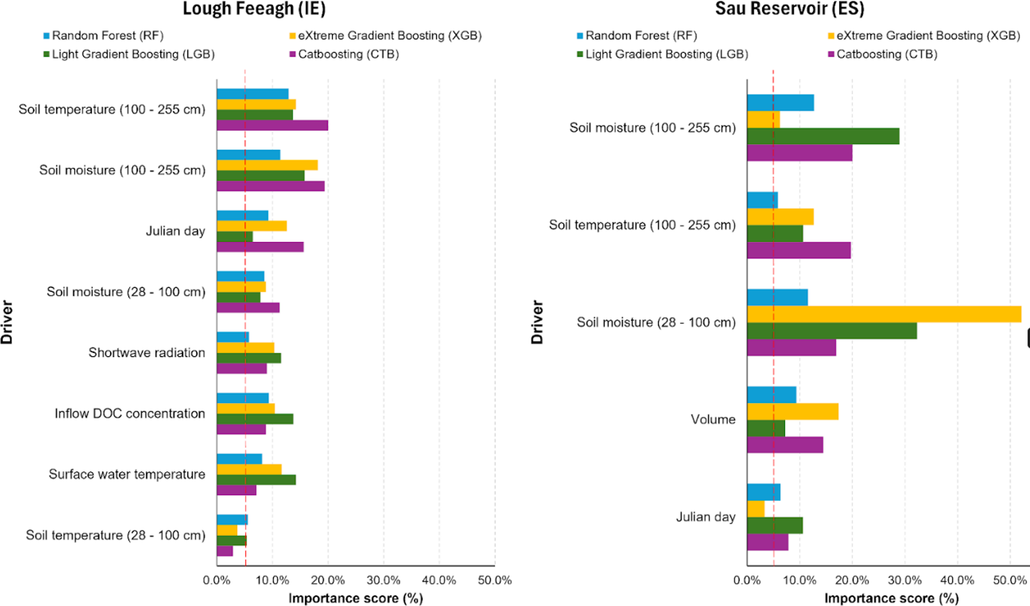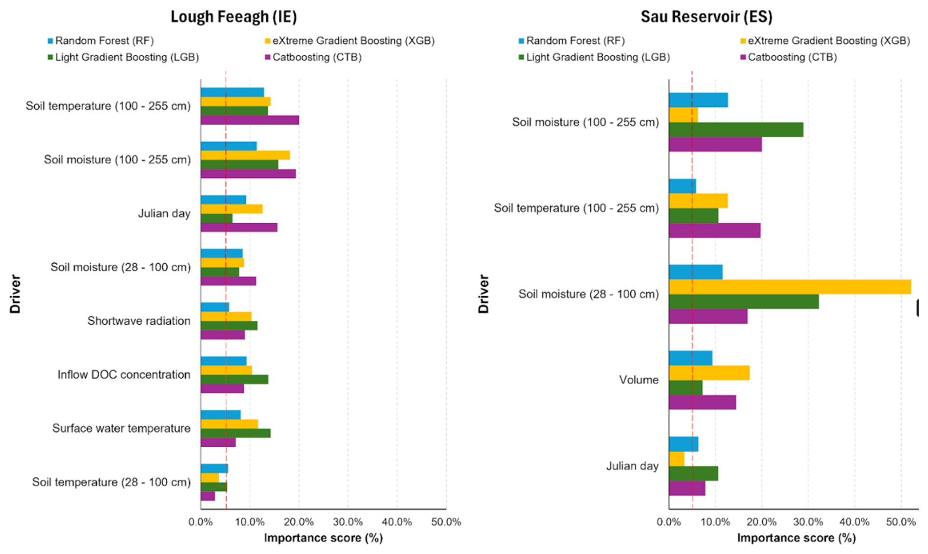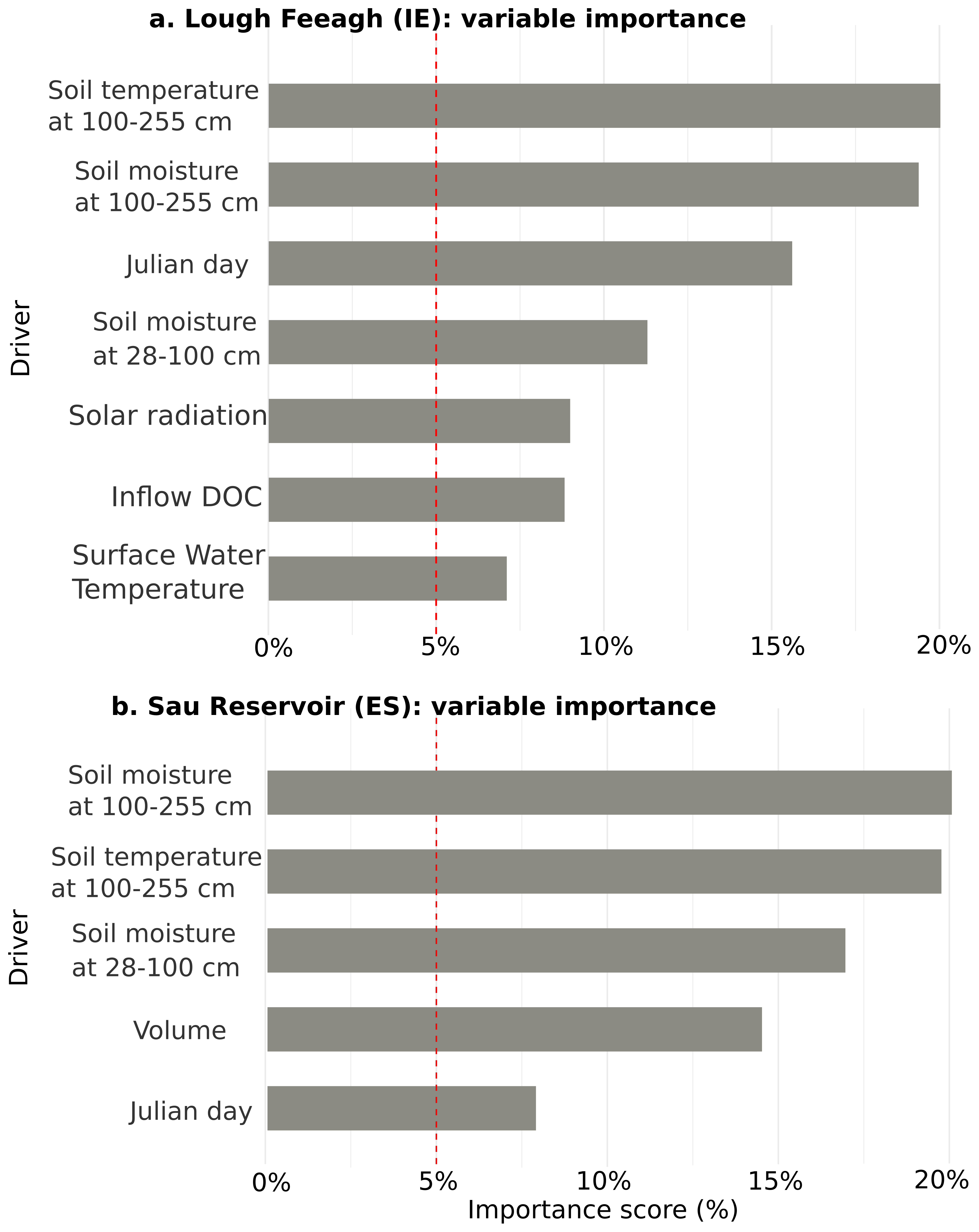 The variables for the deepest soil layer were relevant for both study sites. Soil temperature and soil moisture at 100–255 cm, were the most influential drivers for Feeagh. Similarly, for Sau, soil moisture and temperature at similar depths were the most influential drivers. Another key driver that was shared between Feeagh and Sau was Julian day. Lake volume was only important for Sau, while solar radiation, the amount of carbon entering the water body (indicated by the DOC inflow concentration) and both soil moisture and temperature at 28–100 cm were only influential for Feeagh.