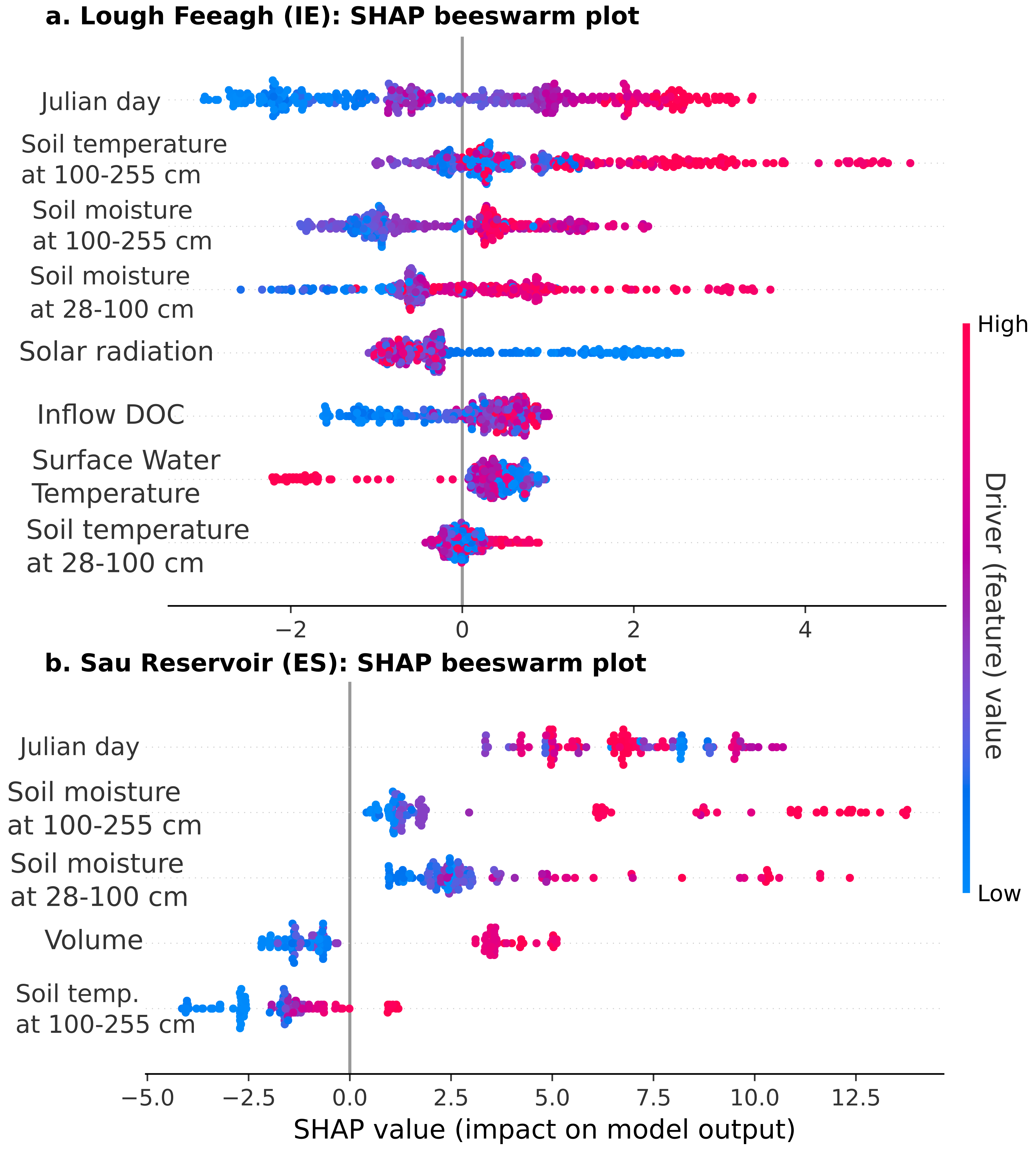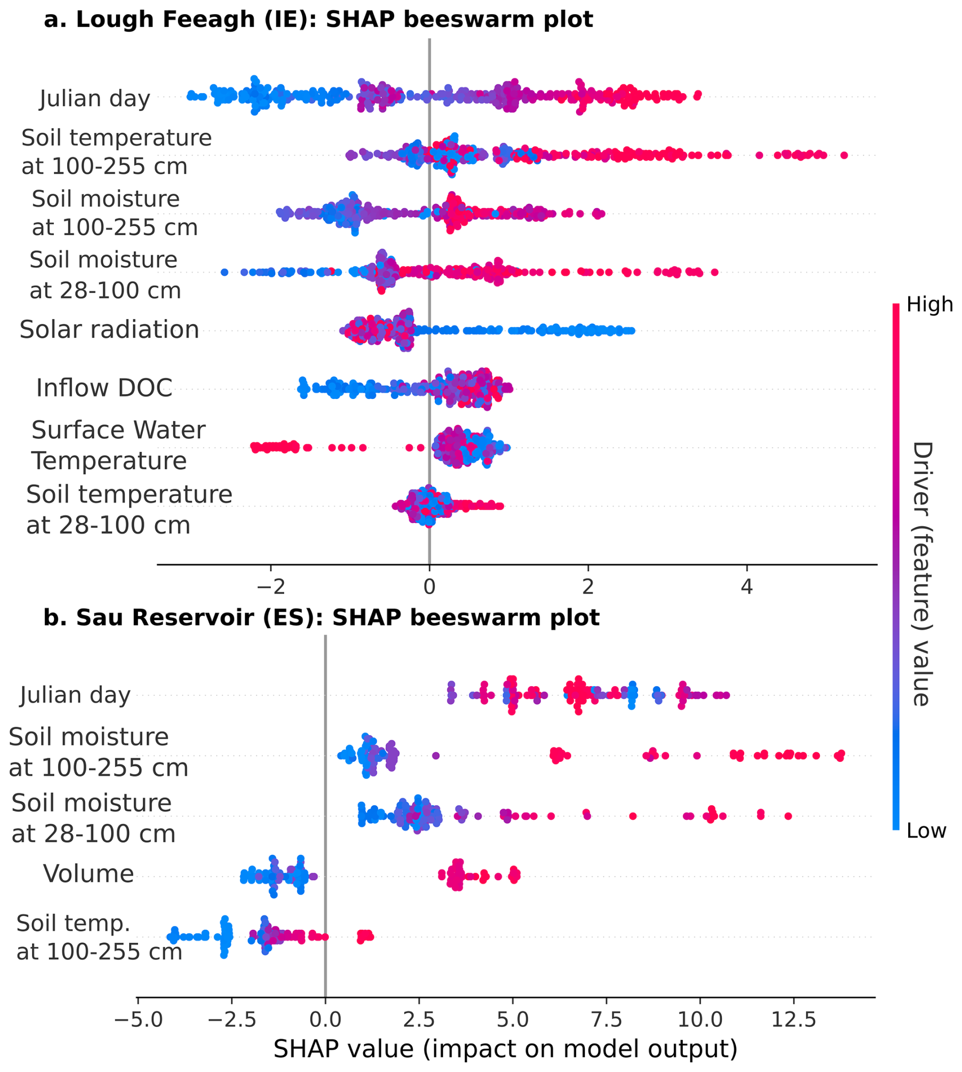 Seasonality plays a crucial role in fDOM predictions, as evidenced by the relationship of the Julian day driver with DOM dynamics at both sites (Fig. 4). At the Irish site, DOM seasonality is primarily shaped by natural environmental processes, whereas in the Spanish site, human influence plays a much greater role. This distinction helps explain why surface lake water temperature and solar radiation, two variables typically linked to strong seasonal patterns, were important only for Feeagh, while reservoir volume was significant only for Sau (Figs. 3, 4, A9 and A10). Volume and soil variables produce a similar effect on fDOM as Julian day at Sau, given that higher volumes closer to the winter season can lead to higher fDOM values. Incorporating Julian day into the workflow offers a simple yet effective way to represent seasonality, potentially replacing seasonal variables (e.g., air temperature) (see the correlation matrix of all drivers in Fig. A12). This proves that the use of machine learning approaches opens up opportunities to assess diverse drivers under contrasting conditions.