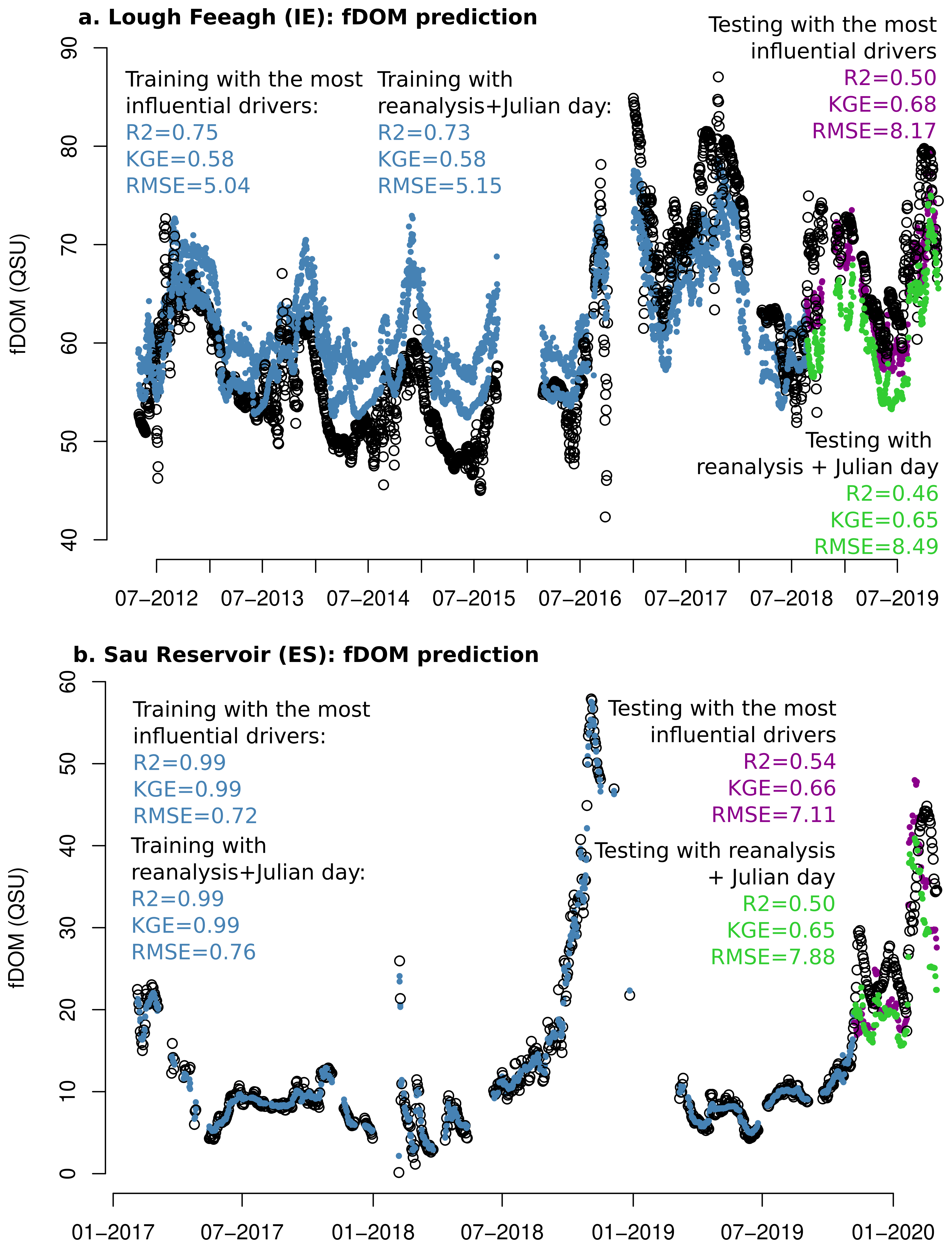 Figure 5 presents the fDOM prediction performance of the CatBoost model (best ML model overall) for Feeagh and Sau, using different input configurations. The models were trained on 85 % of the time series (blue points) and tested on the remaining 15 % using a hold-out approach (violet and green points). Two scenarios were compared: one using the most influential drivers (8 for Feeagh, 5 for Sau), and a second using only a reduced subset of reanalysis-based and easily accessible drivers, specifically soil temperature, soil moisture, and Julian day.