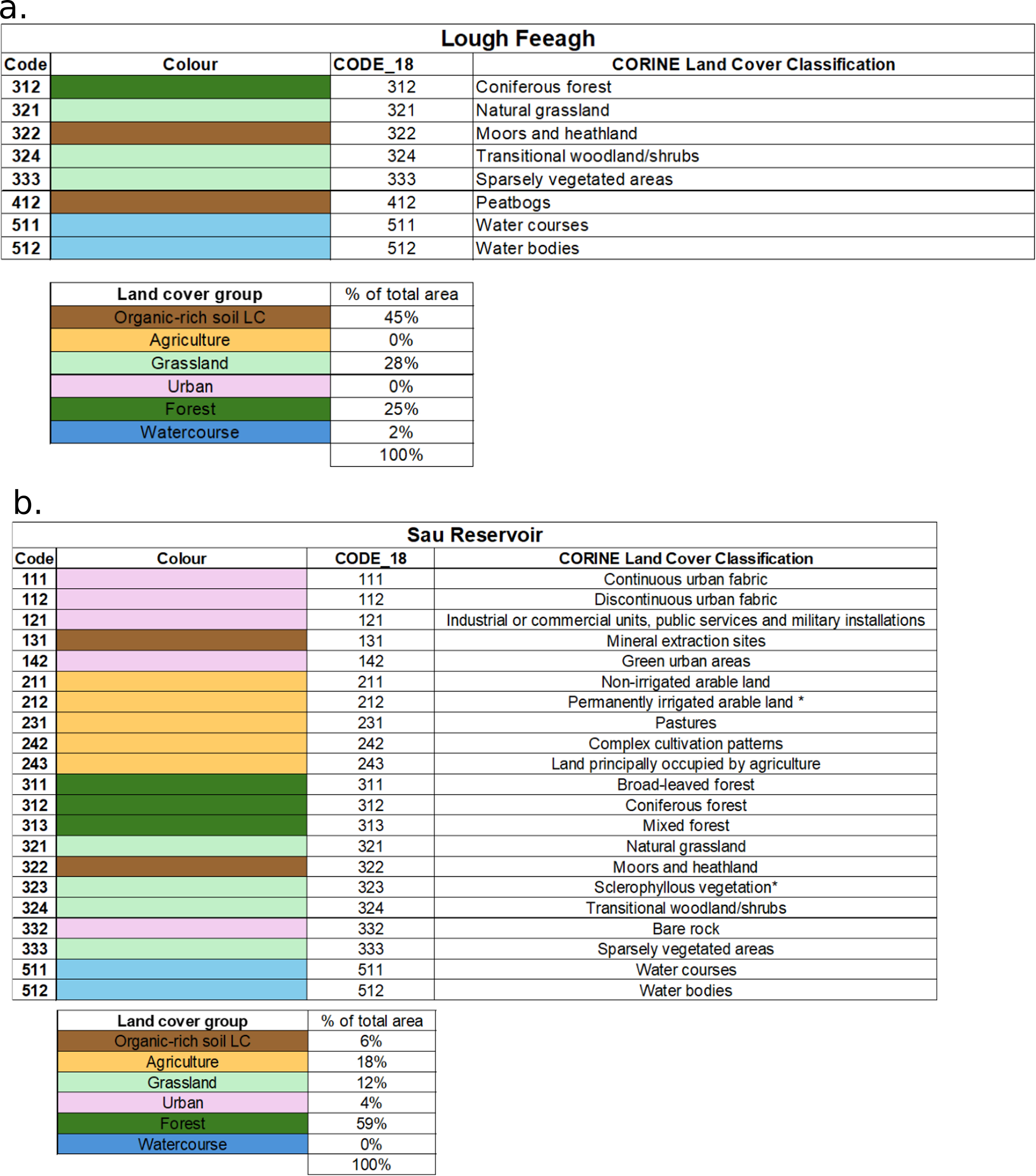 Figure 1Two contrasting freshwater ecosystems: Lough Feeagh (Ireland) and Sau Reservoir (Spain). The figure shows their locations and catchment land cover. Lough Feeagh is a humic oligotrophic lake with a peatland-dominated catchment and temperate oceanic climate, whereas Sau is a eutrophic reservoir with a human-influenced catchment and Mediterranean climate. The CORINE Land Cover 2018 https://doi.org/10.2909/960998c1-1870-4e82-8051-6485205ebbac (EEA, 2020) classes were grouped into the categories shown for visual clarity, following the aggregation approach described in the Appendix (Fig. A2).