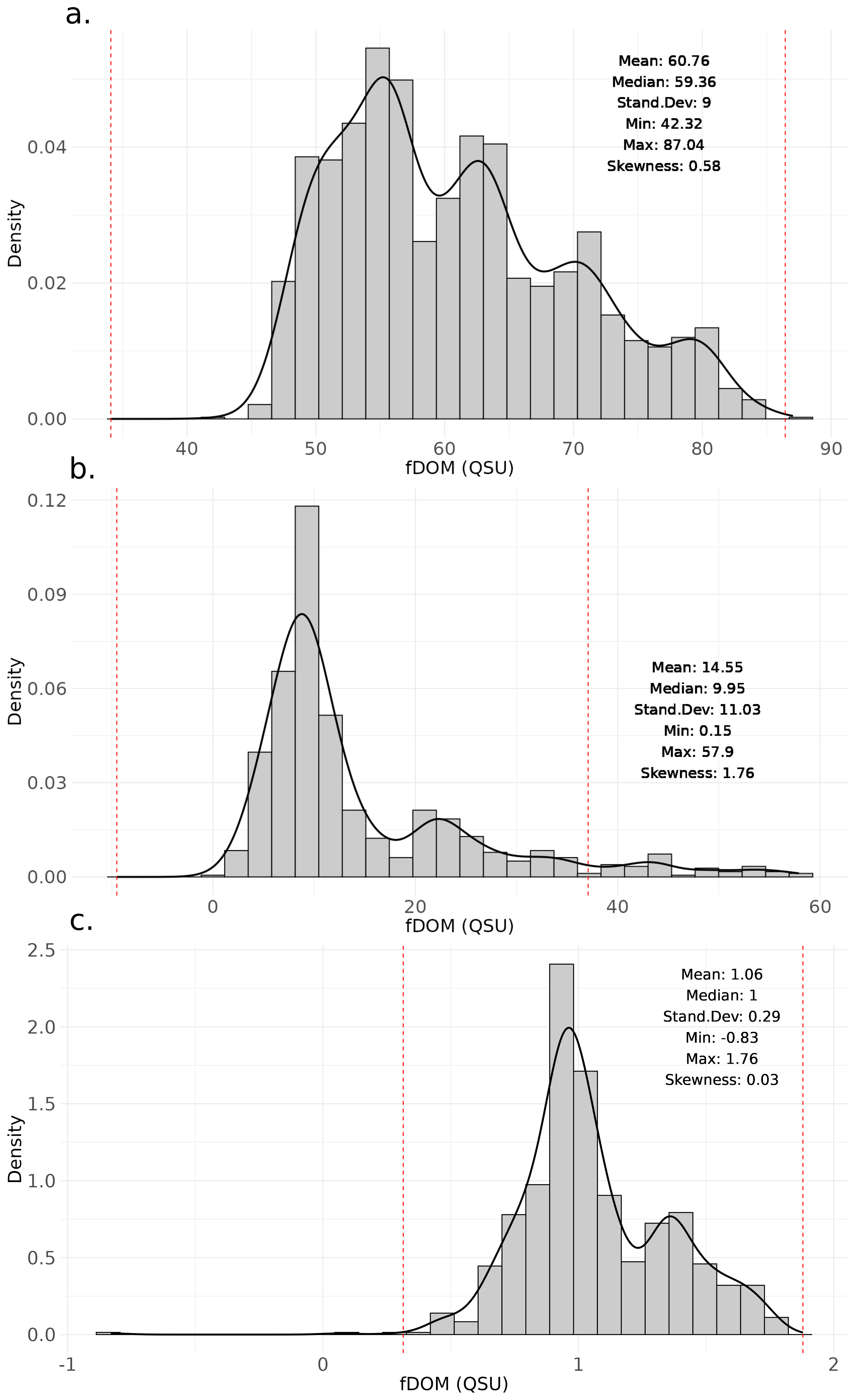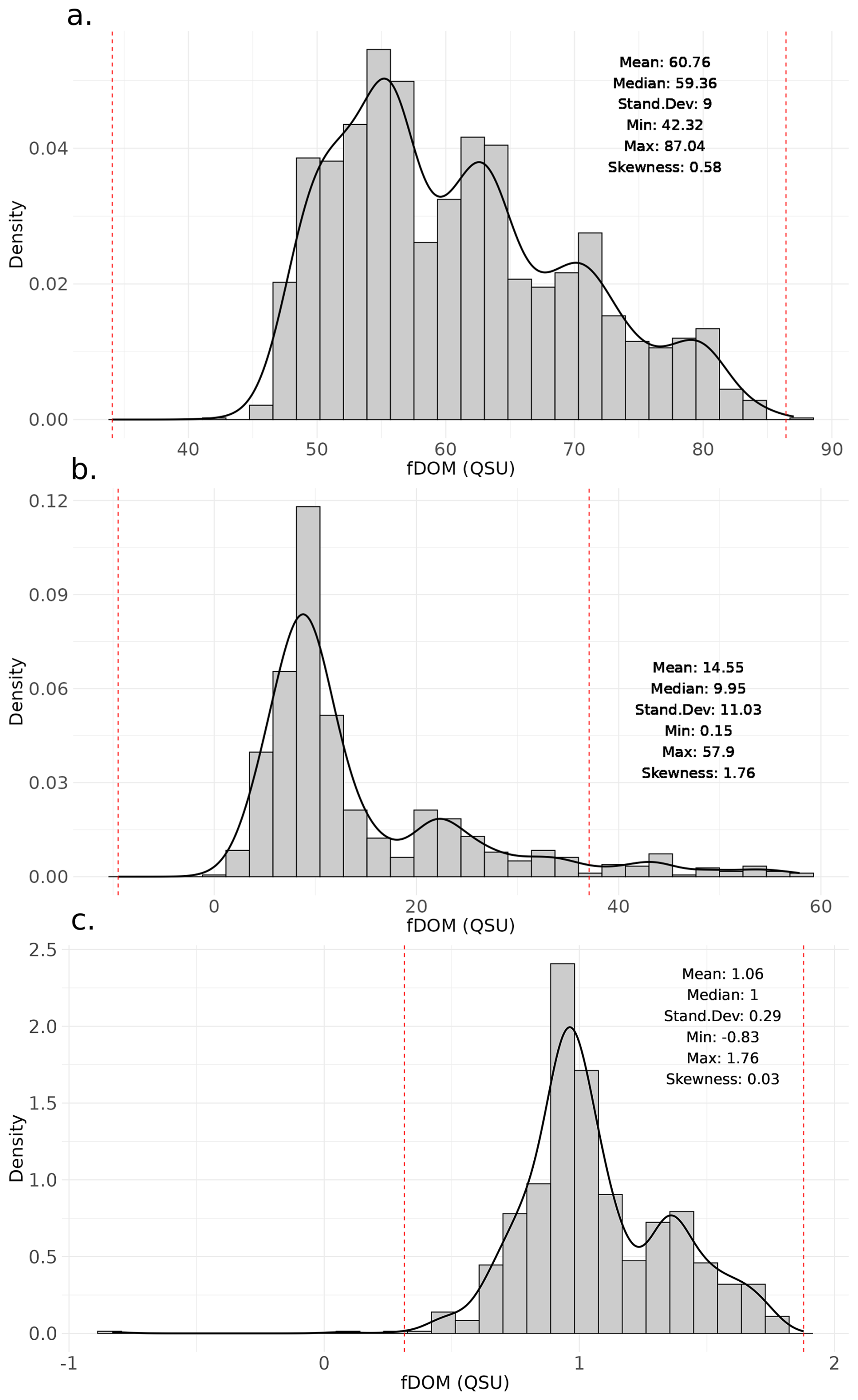 Data inspection and exploration: the target variable (fDOM) at one of the study sites (Feeagh) exhibits low to moderate skewness (approximately 0.5) with relatively few outliers, whereas the other study site (Sau) displays higher skewness (greater than 1 but below 2) and several extreme values. Zero-inflation does not appear to be an issue at either site.
