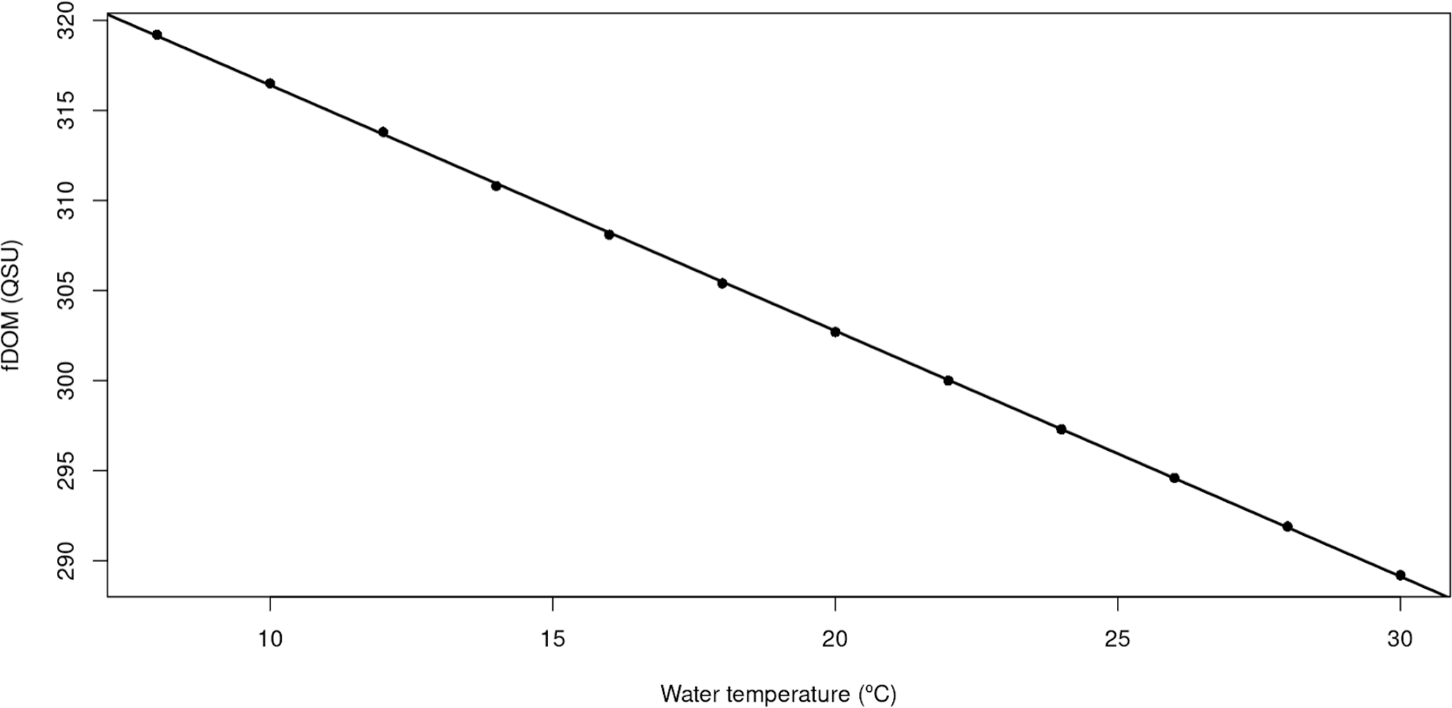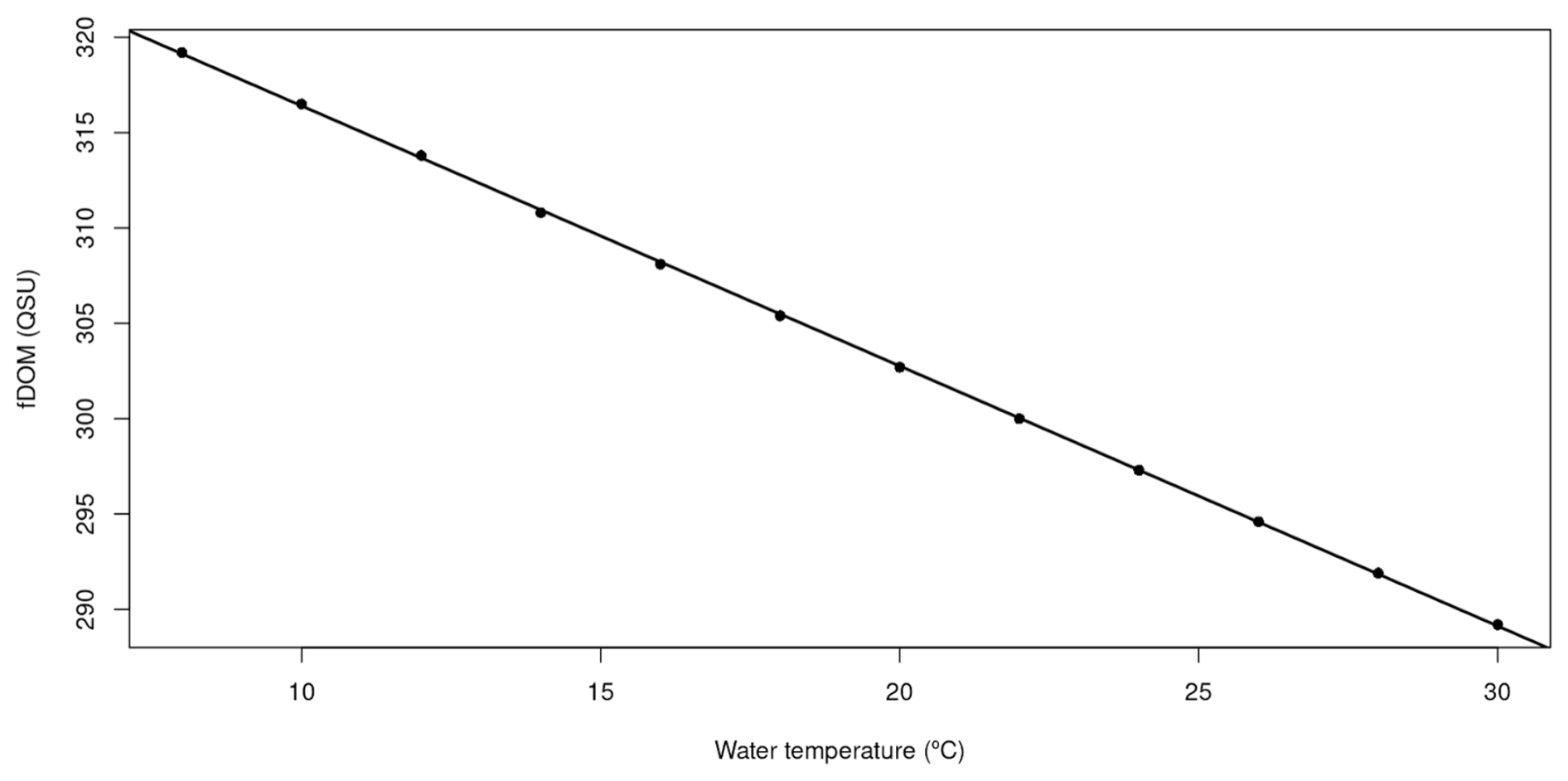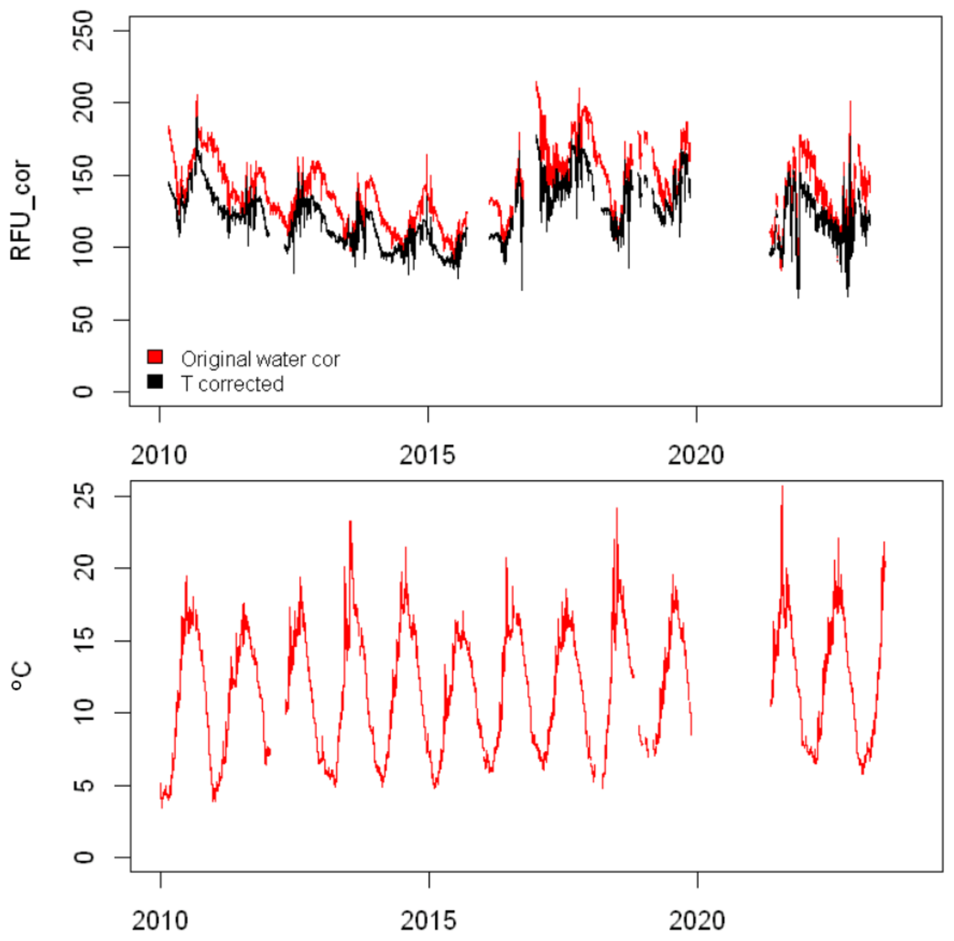In Feeagh, fDOM data was corrected for the temperature quenching effect in previous scientific studies. The raw measurements were corrected using the compensation approach described by (Watras et al., 2011; Ryder et al., 2012). Corrected fluorescence was calculated relative to a reference temperature of 20 °C using: where T is the sonde water temperature (°C) and k is the temperature correction coefficient (k=−0.0168 for Feeagh, derived as the average of monthly values reported by Ryder et al. (2012)).