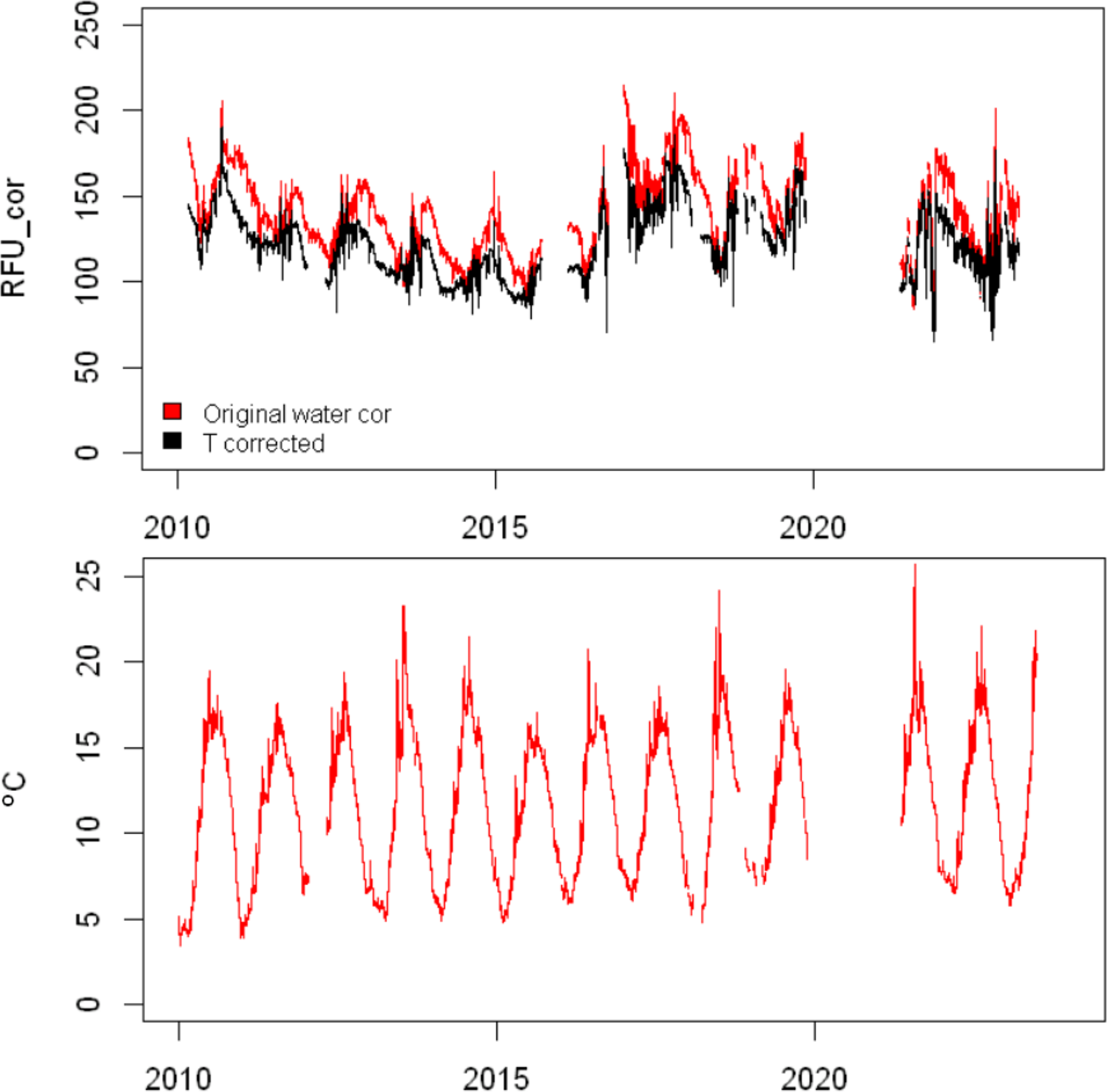 Figure A4Upper panel: Raw (blue) and temperature-corrected (red) fDOM measurements for Feeagh; lower panel: surface water temperature sonde measurements at Feeagh.