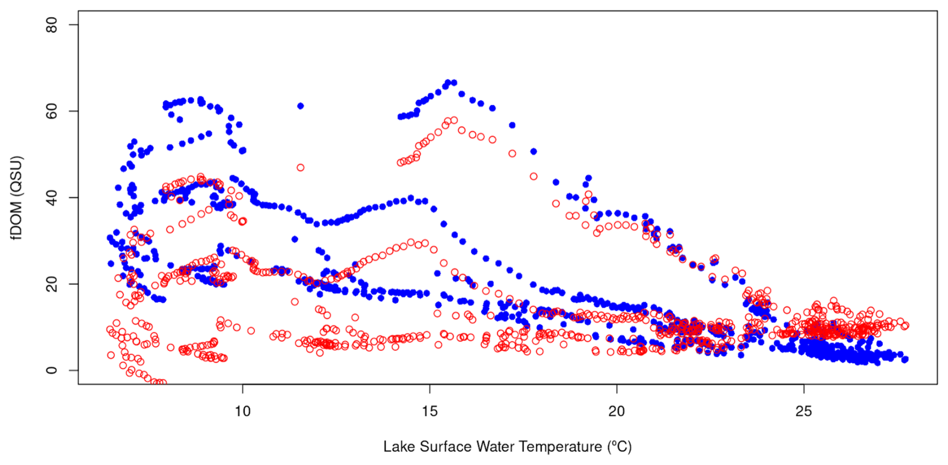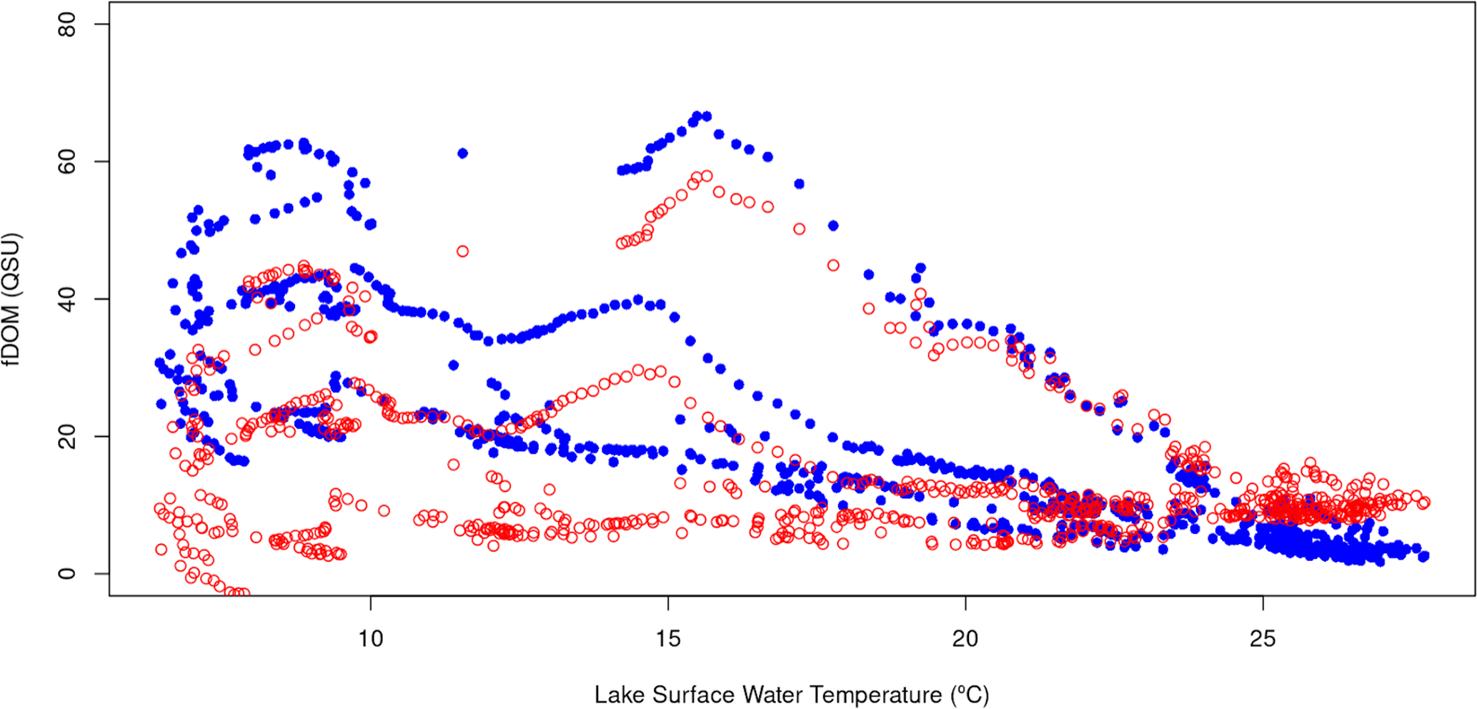 Then, fDOM data in Sau was corrected following this linear regression and surface water temperature on the lake. Figure A6 presents the uncorrected values in blue and corrected values in red (8 negative values were removed from the total sample of 777)