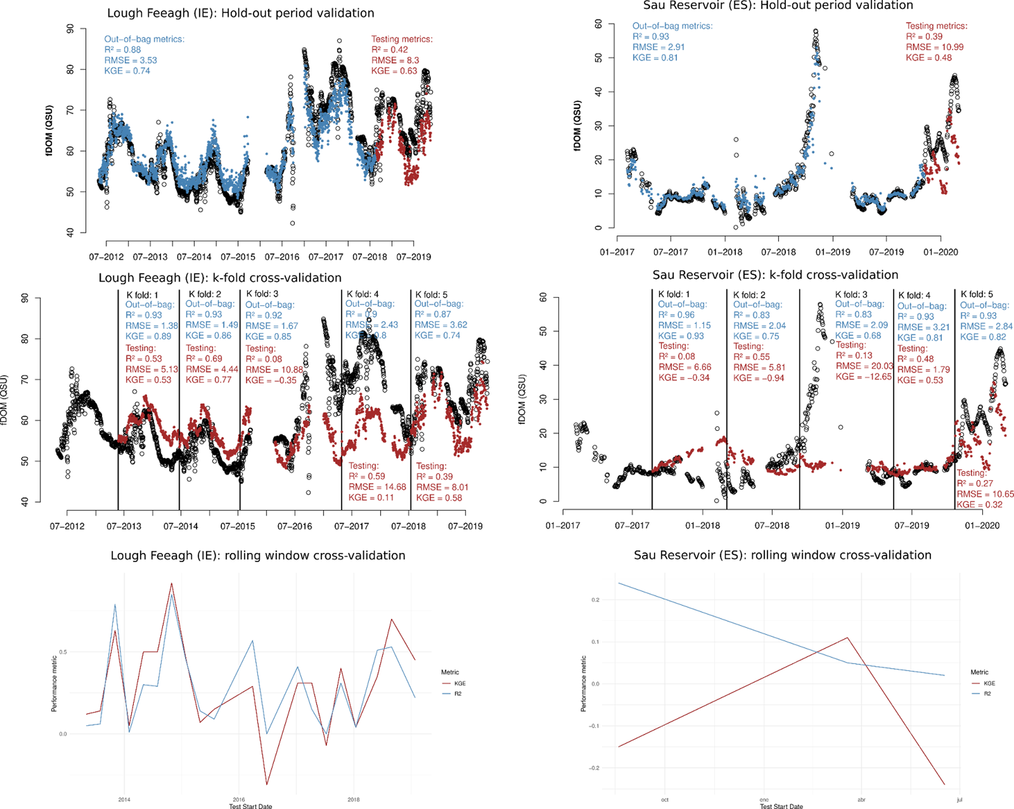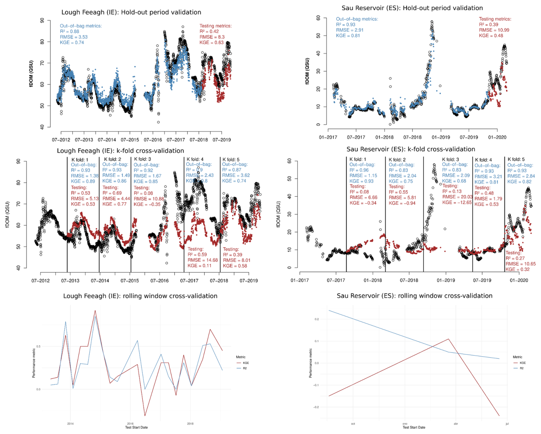 Figure A7Comparison of validation methods using random forest for both study sites: hold-out period method used in the main manuscript, k-fold cross-validation method using k=5, and rolling window cross-validation using training size of two year, testing size of one year, and a shift window every 90 d. For this method, in the case of Sau Reservoir it is not possible to get a clear analysis due to the limited data.