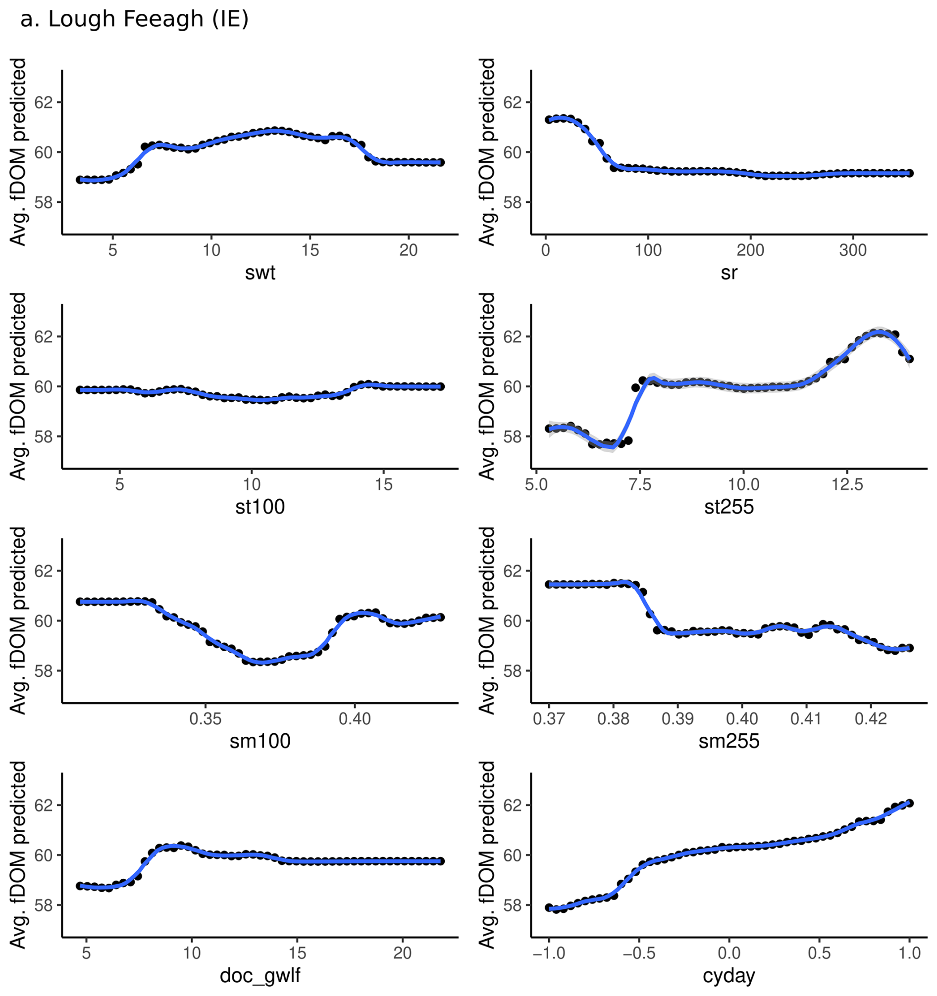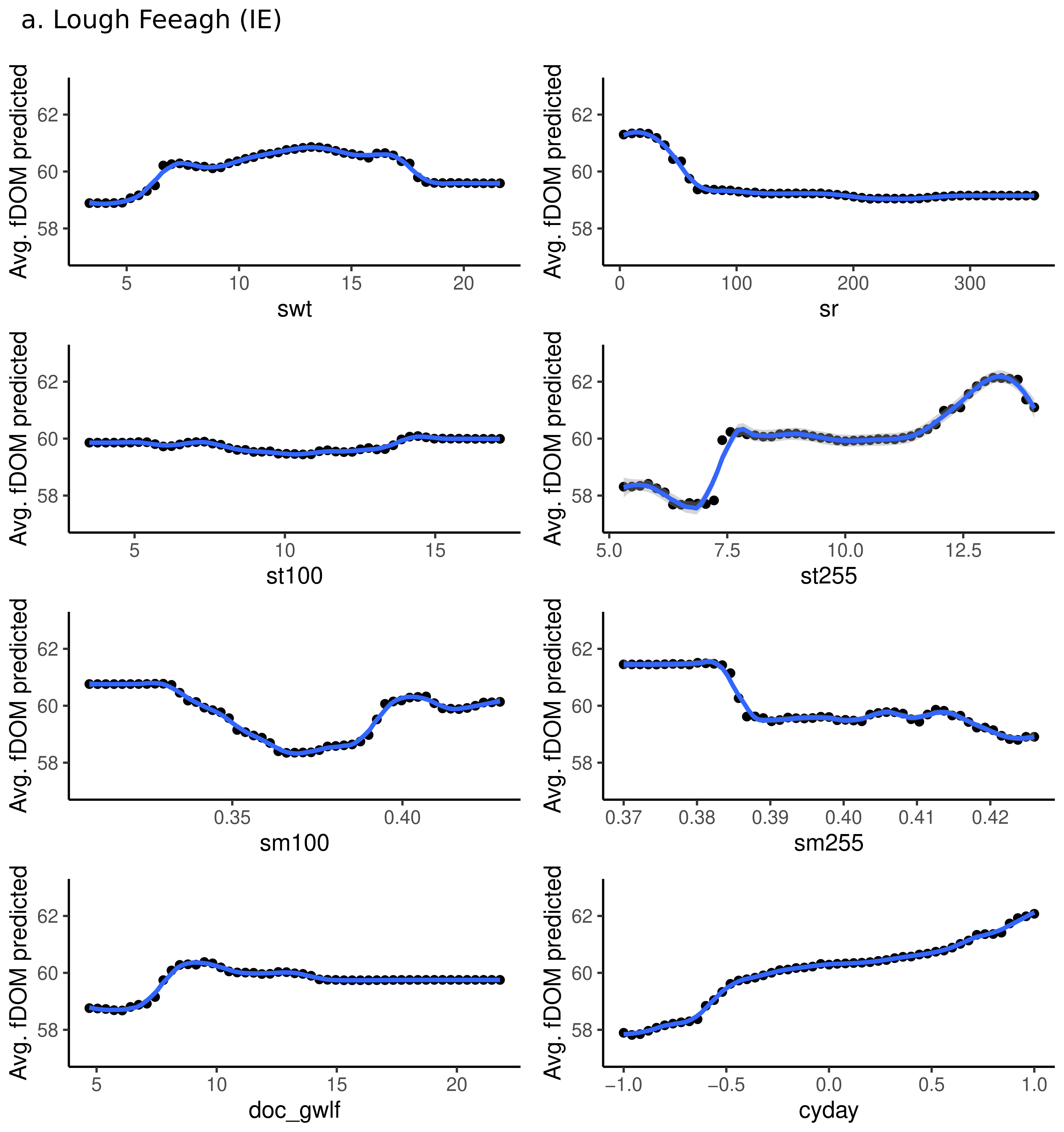 Our approach offers the opportunity to validate and deploy a workflow capable of delivering daily DOM predictions in both undisturbed and anthropized sites, even when only limited data on input drivers are available, while at the same time providing insights into the dominant drivers. However, a site-specific model validation, including identification of appropriate training and testing periods, hyperparameter tuning for each specific study site and assessment of overfitting is essential. In terms of driver attribution, it is of note that the relationships identified using machine learning may not always be related at a process level (Sullivan, 2022). In our case, however, many of these same drivers had already been identified for river DOC levels in the Feeagh catchment (e.g., Doyle et al., 2019; Ryder et al., 2014). While the workflow can be easily replicated, fDOM data or data for another proxy for DOM are required. It is of note that such proxies of DOM are increasingly being incorporated into water quality monitoring programmes, an aspect that is convenient for testing workflows such as the one described (Downing et al., 2012).